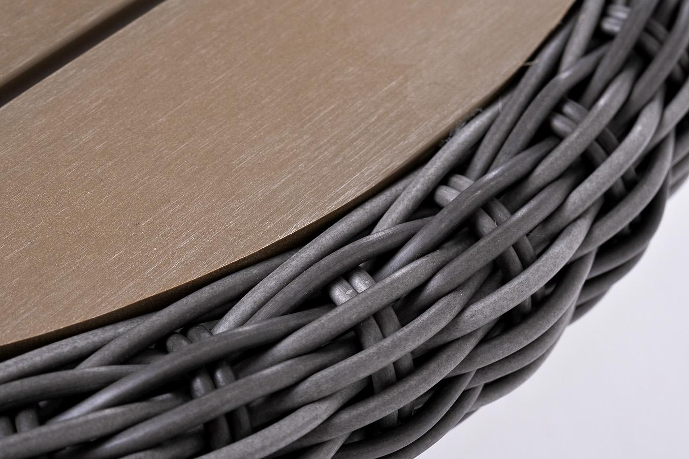Столик «Равенна» может использоваться как в роли кофейного, так и в качестве детского обеденного стола, в комплект к которому подходят детские кресла из этой серии. Размер модели – 600×600×480 мм. Столик располагает прочным каркасом, который изготовлен из качественного алюминия, отвечающий за надежное расположение конструкции. Весь каркас оплетен вручную круглым искусственным ротангом графитового цвета. Рабочая поверхность столика выполнена из древесно-полимерного композита (ДПК). Материал обл