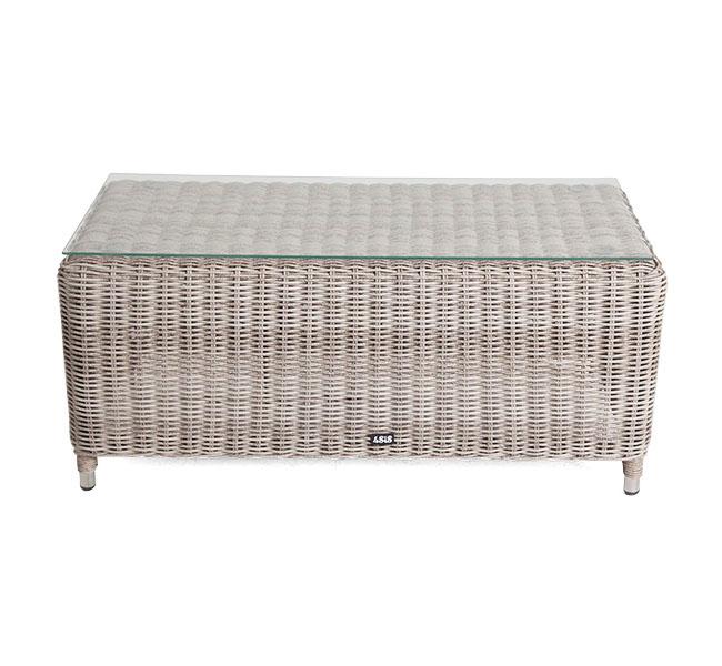 Журнальный столик «Кон Панна» изготовлен из алюминиевого каркаса, вручную оплетенного круглым искусственным ротангом бежевого оттенка. На поверхности столика закреплена стеклянная столешница, которая выполнена из крепкого закалённого стекла толщиной 5 мм. Размер - 1000×500×420 мм.