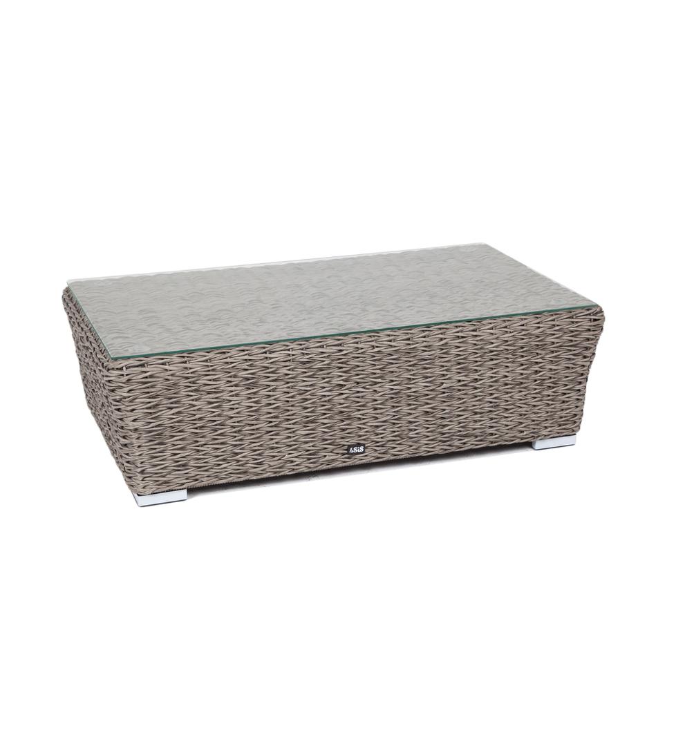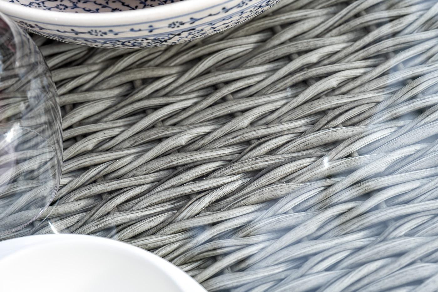 Журнальный столик «Капучино» из искусственного ротанга вида "гиацинт" серого оттенка обладает прочным каркасом, изготовленным из алюминия, оплетка которого произведена ручным способом. Поверхность защищена столешницей из 5 мм стекла. Размеры модели: 1100×660×340 мм.