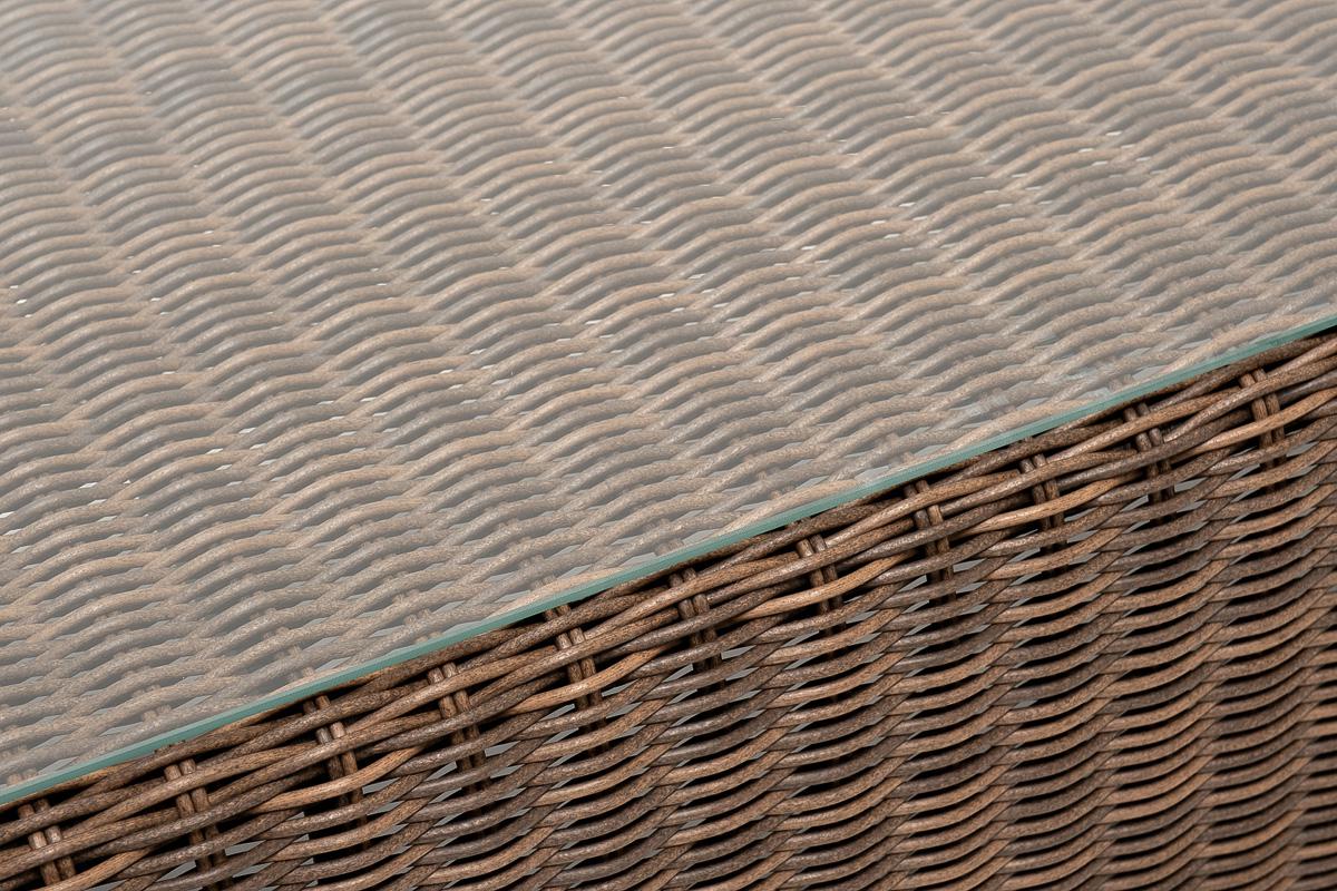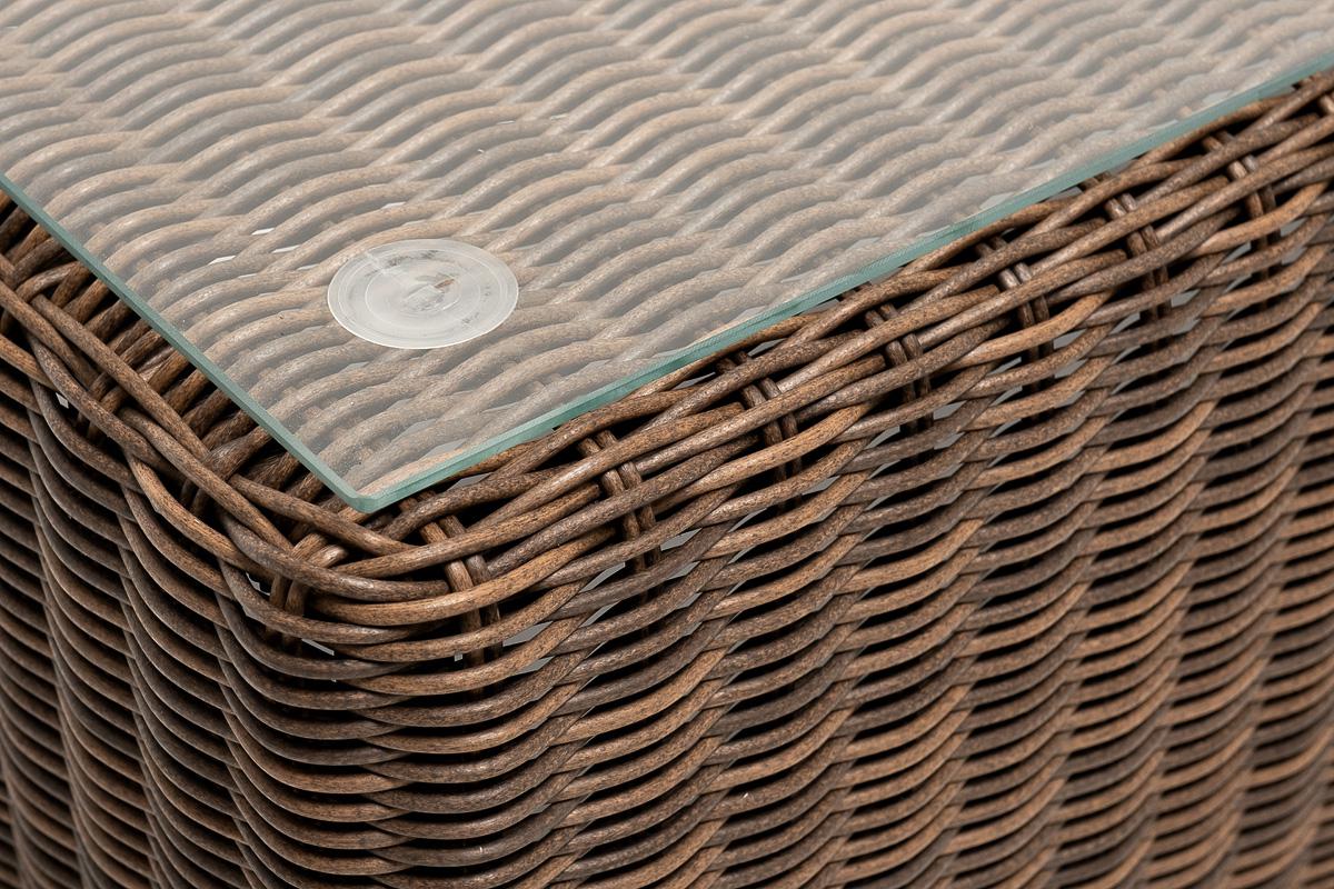 Журнальный столик «Боно» используется как в комплекте, так и в качестве отдельного предмета для сада, открытой террасы или балкона. Каркас столика изготовлен из алюминия, вручную оплетенного круглым искусственным ротангом. Столешница из закаленного стекла толщиной 5 мм. Благодаря износостойким материалам, стол пригоден для использования на улице при любой погоде и не требует специальных условий хранения. Плетеный столик представлен в коричневом цвете. Размеры стола: 1300×600×400 мм, вес 2