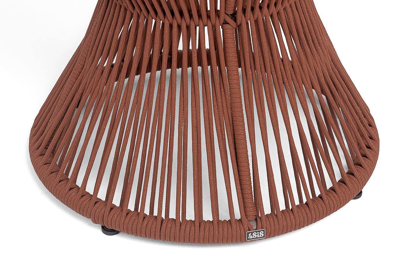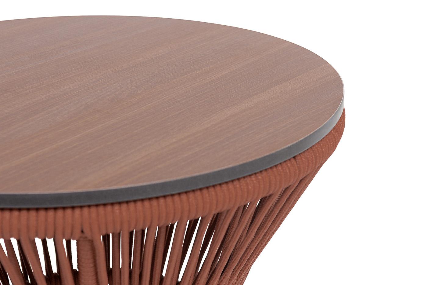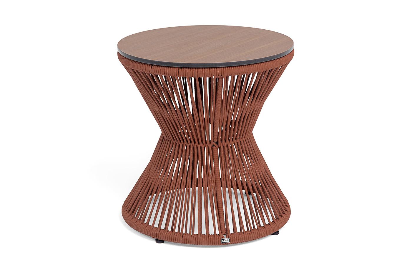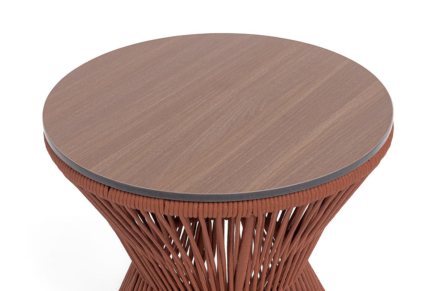 Стол журнальный 4SIS "Мадрид" журнальный стол из HPL круглый Ø50 H55, каркас из алюминия коричневый (RAL8016) муар, цвет "дуб", роуп красный (8372) круглый tex арт. OAK-D50H55-MAD-Al-RAL8016Mua-T-red8372-4sis