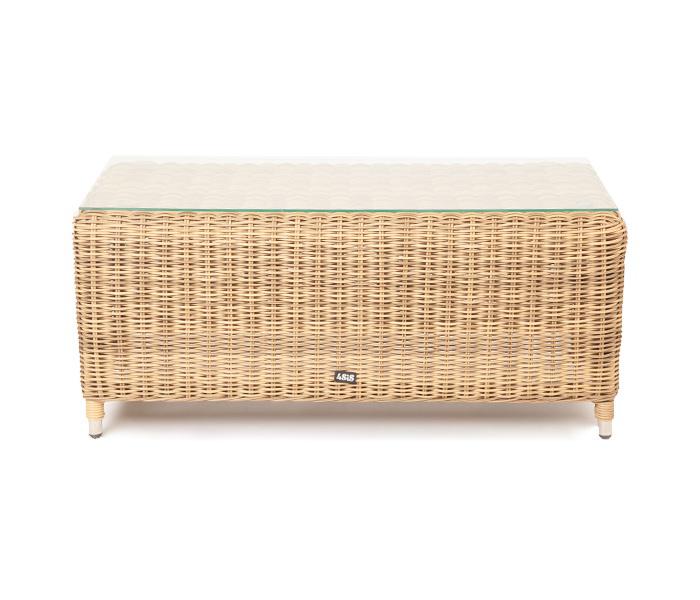 Журнальный столик из круглого искусственного ротанга «Кон Панна» соломенного цвета, подходит для эксплуатации при различных погодных условиях. Модель оснащена прочным каркасом, изготовленным из алюминия. В качестве столешницы используется ударопрочное закаленное стекло толщиной 5 мм. Размеры: 1000×500×420 мм.