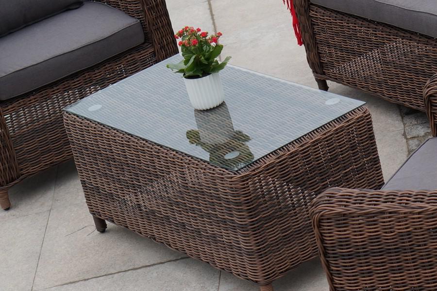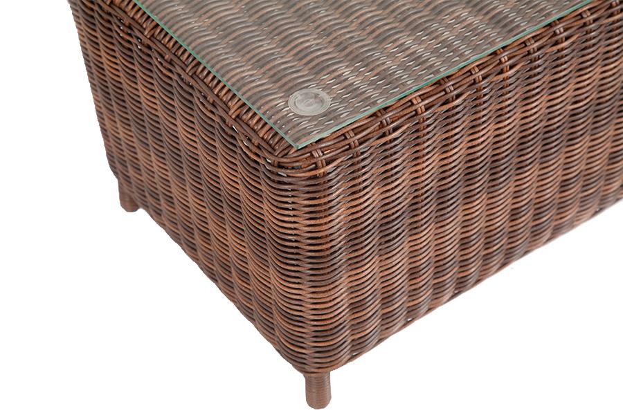 Журнальный столик «Кон Панна» увеличивает функциональность зоны отдыха с креслами и диваном. Размер модели – 1000×500×420 мм. В основе мебели находится алюминиевый каркас высокой прочности. Декоративной составляющей является ручная круглая оплетка, которая выполнена из искусственного ротанга. Столик представлен в шоколадном цвете. В роли рабочей поверхности выступает столешница из закаленного стекла, которое отличается высокими эксплуатационными свойствами. Его толщина достигает 5 мм.
