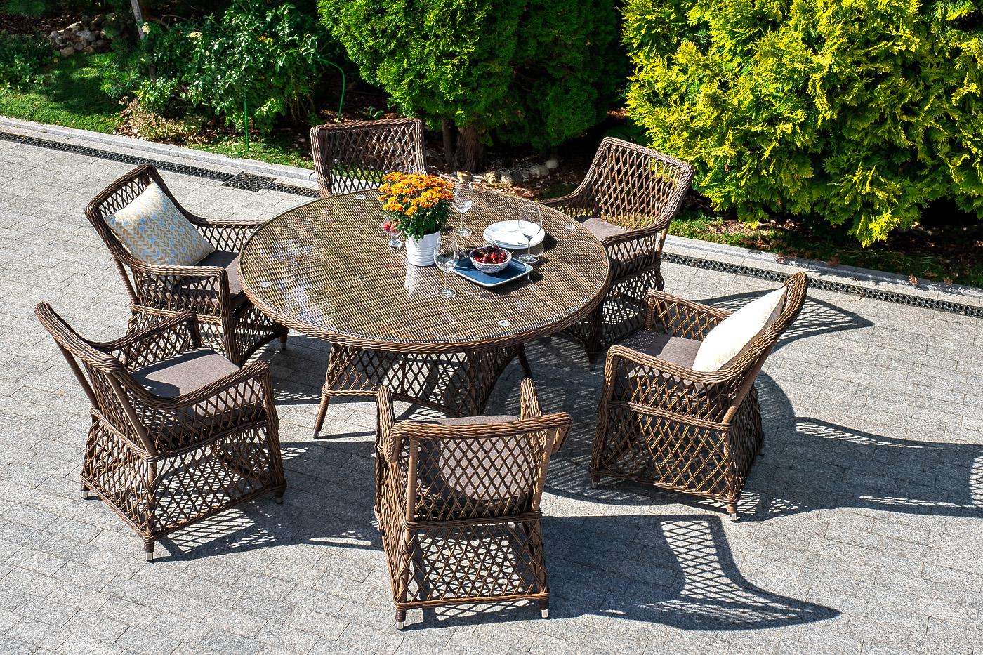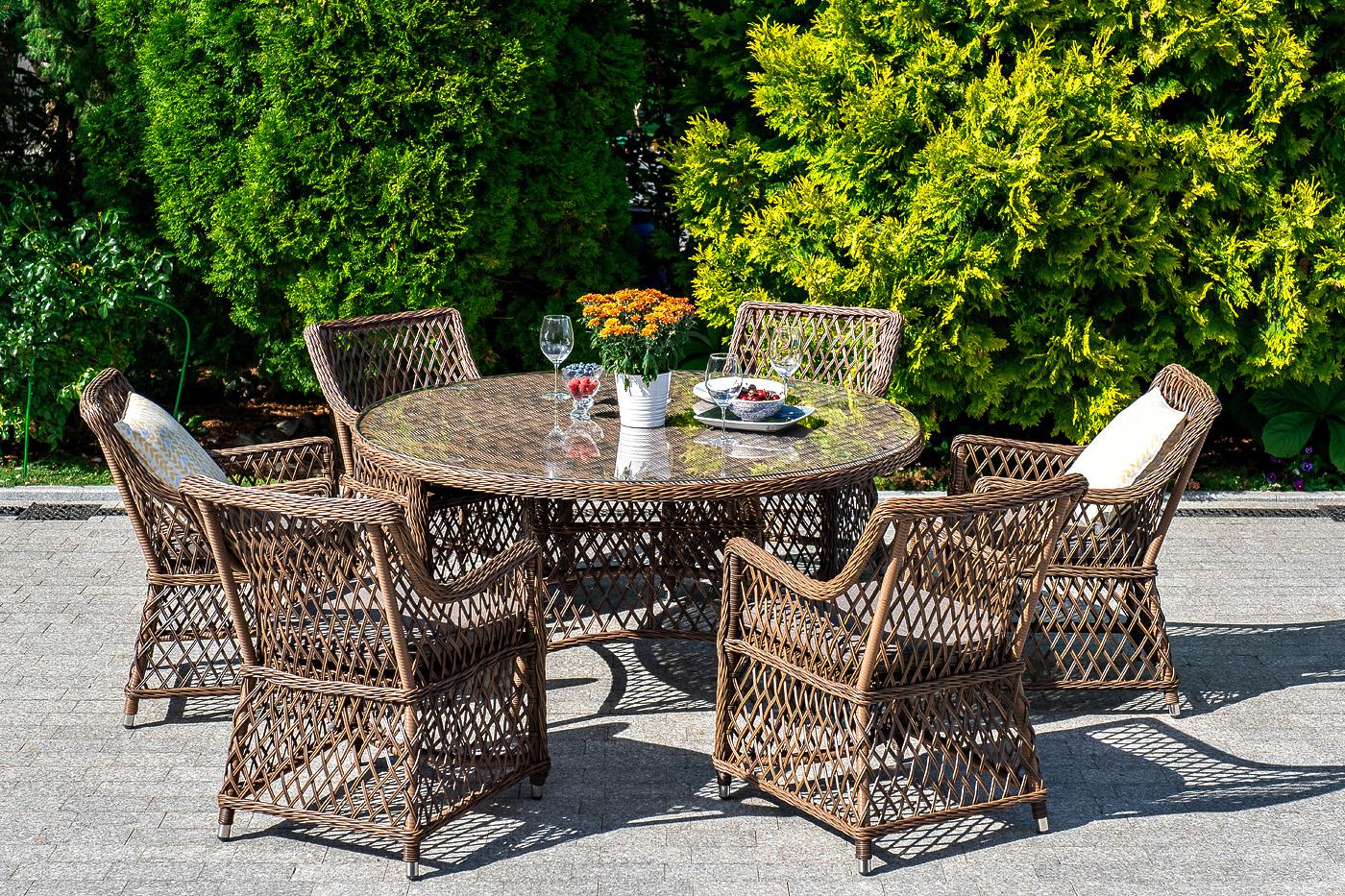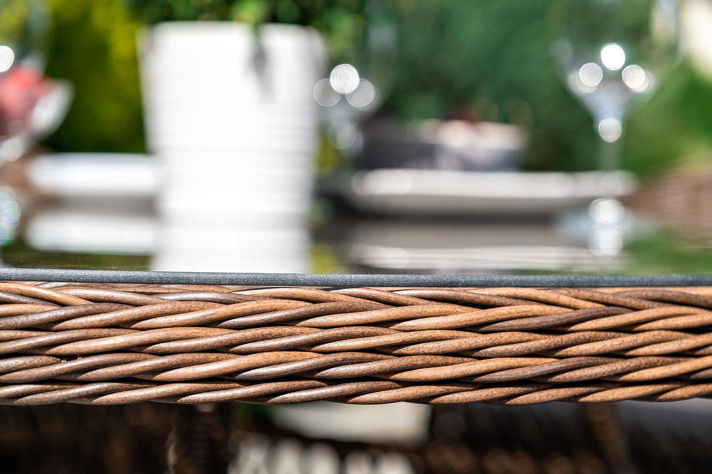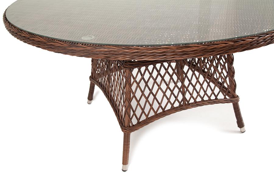 Стол садовый из искусственного ротанга «Эспрессо» является отличным решением, если стоит вопрос о создании обеденной зоны на открытом пространстве. Диаметр рабочей поверхности 150 см, а высота составляет 75 см. Плоскость защищена ударопрочной стеклянной 5 мм столешницей. Каркас изготовлен из прочного алюминия, который вручную обвит круглым искусственным ротангом коричневого цвета.