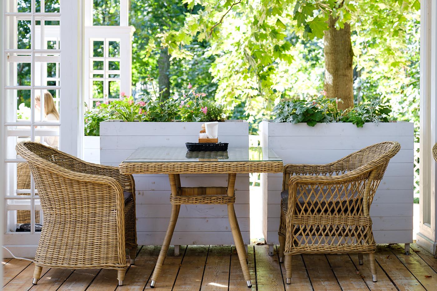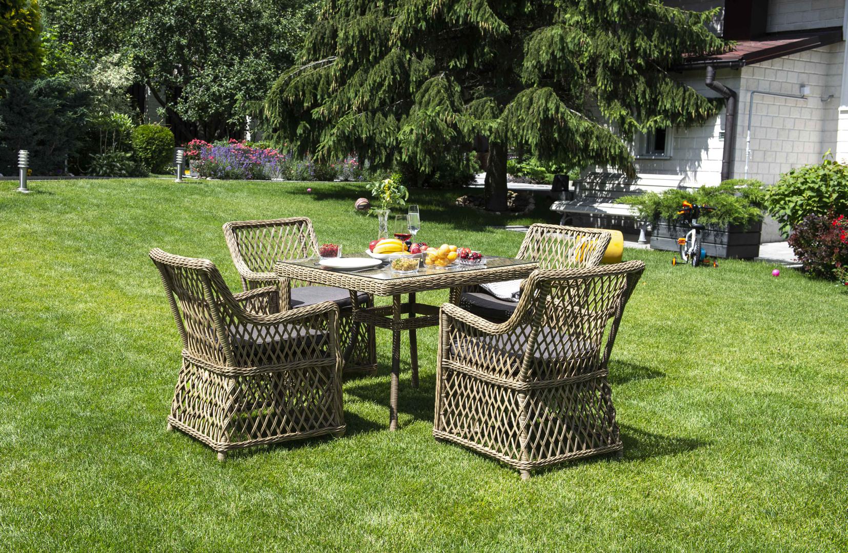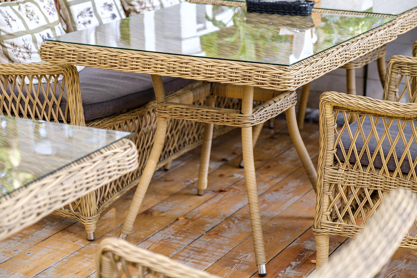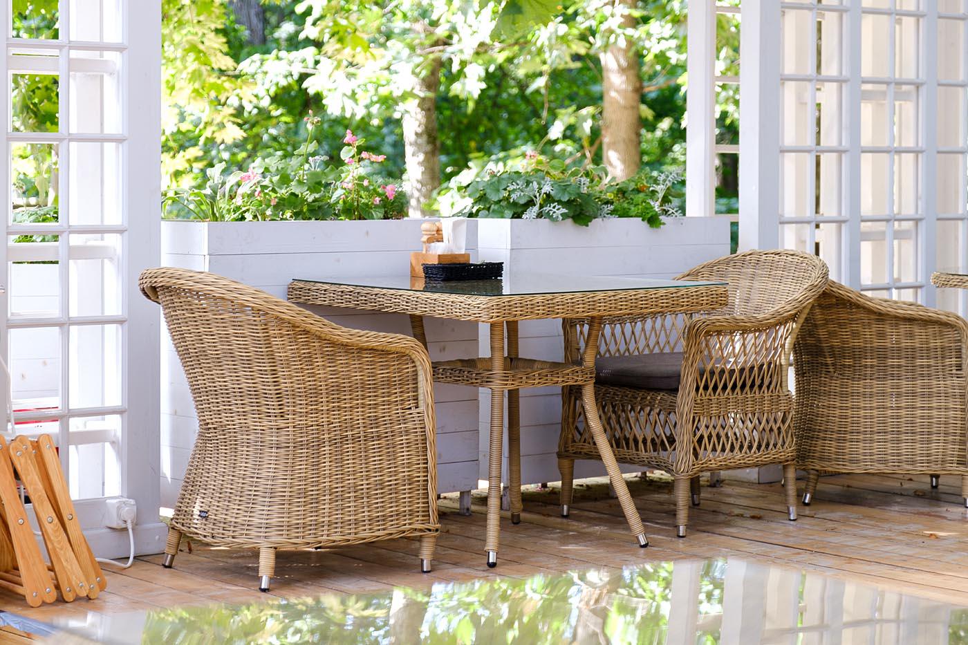 Плетеный садовый стол «Айриш» для обустройства обеденной зоны на открытом пространстве. Каркас изготовлен из прочного алюминия, вручную оплетенного круглым искусственным ротангом натурального соломенного оттенка. В качестве столешницы использовано ударопрочное стекло, толщиной 5 мм. На стол можно ставить горячие тарелки и чашки, не опасаясь деформации покрытия. Размер садового стола: 900×900×750 мм. Его можно дополнить креслами «Латте» и создать обеденную группу для компании из 4-х челов