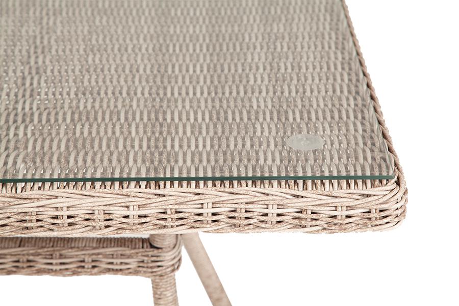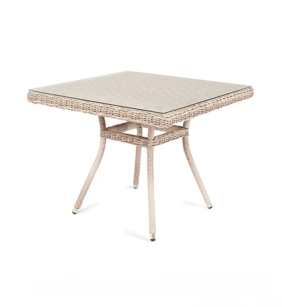 Плетеный стол для сада из искусственного ротанга «Айриш» бежевого цвета идеально вписывается в обеденное пространство на открытом воздухе. В основе стола скелет из алюминия, столешница выполнена из ударопрочного стекла толщиной 5 мм. Габариты: 900×900×750 мм, которые позволяют уместить до четырех человек.