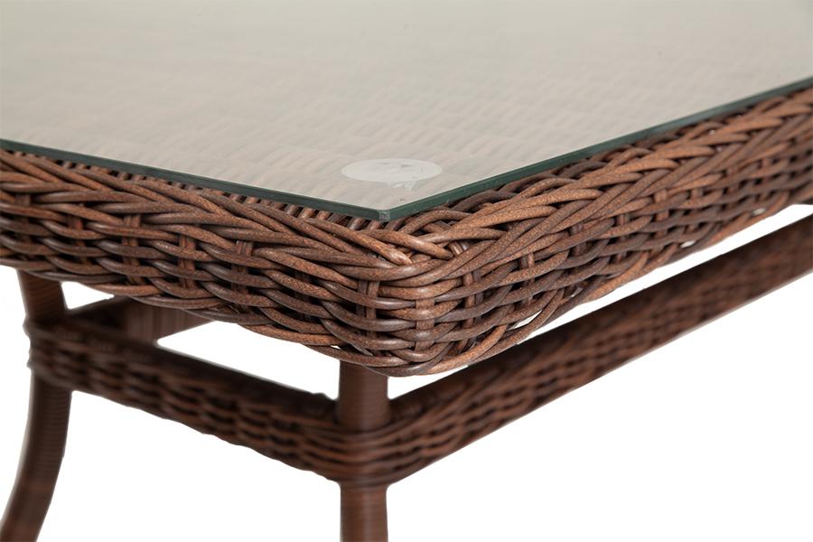 Большой плетеный стол «Латте» для сада или летней террасы ресторана, имеет размеры 2000×900×750 мм. Каркас изделия изготовлен из прочного, но очень легкого алюминия, оплетенного вручную искусственным ротангом круглого плетения насыщенного шоколадного оттенка. Это долговечный материал, устойчивый к переменам погоды, атмосферным осадкам, прямым солнечным лучам. Благодаря ему стол можно использовать круглогодично под открытым небом. Столешница – ударопрочное стекло, толщиной 5 мм. Ножки оснащ