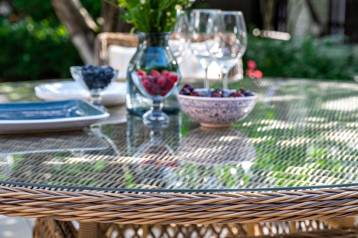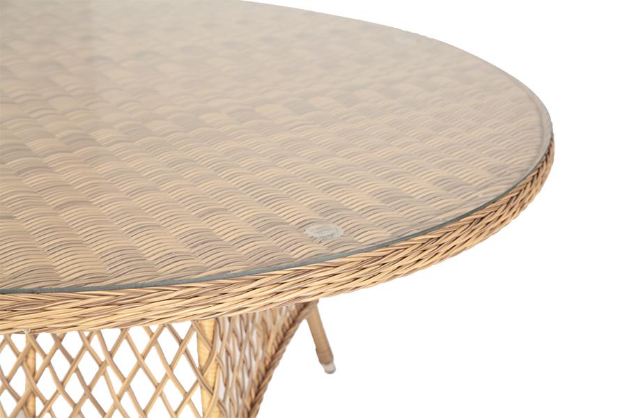 Стол садовый из искусственного ротанга «Эспрессо» прекрасно вписывается на летнюю веранду. Высота модели 75 см, а диаметр поверхности составляет 150 см. В качестве основания выступает каркас, выполненный из алюминия и оплетён круглым искусственным ротангом соломенного цвета. Рабочую плоскость покрывает 5 мм столешница из ударопрочного закаленного стекла.