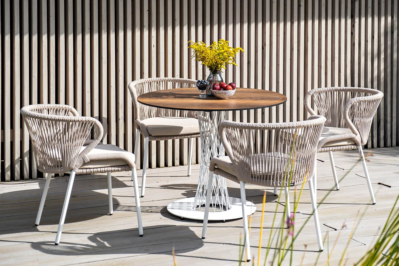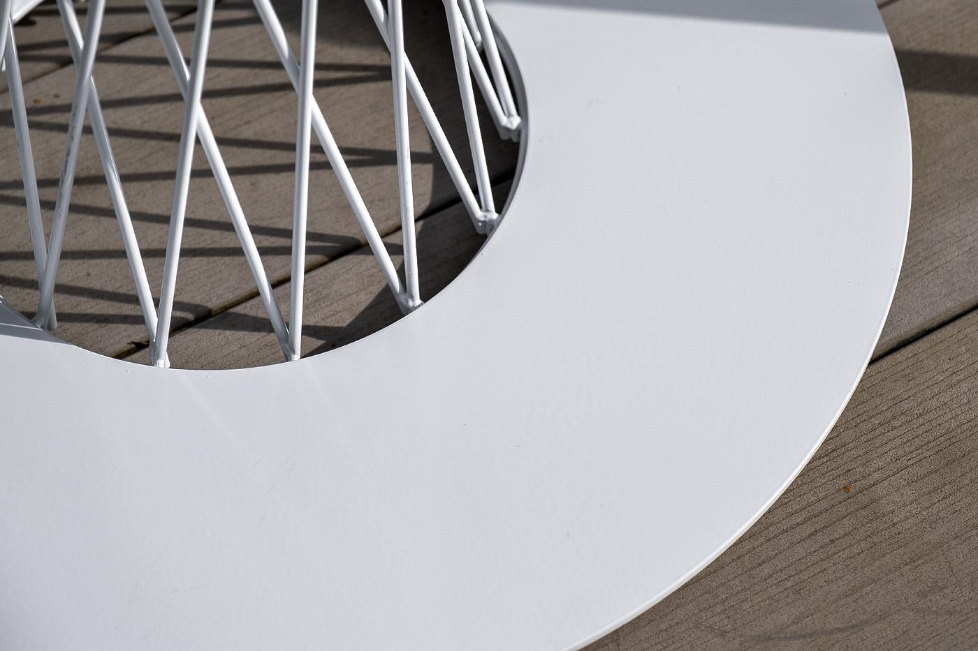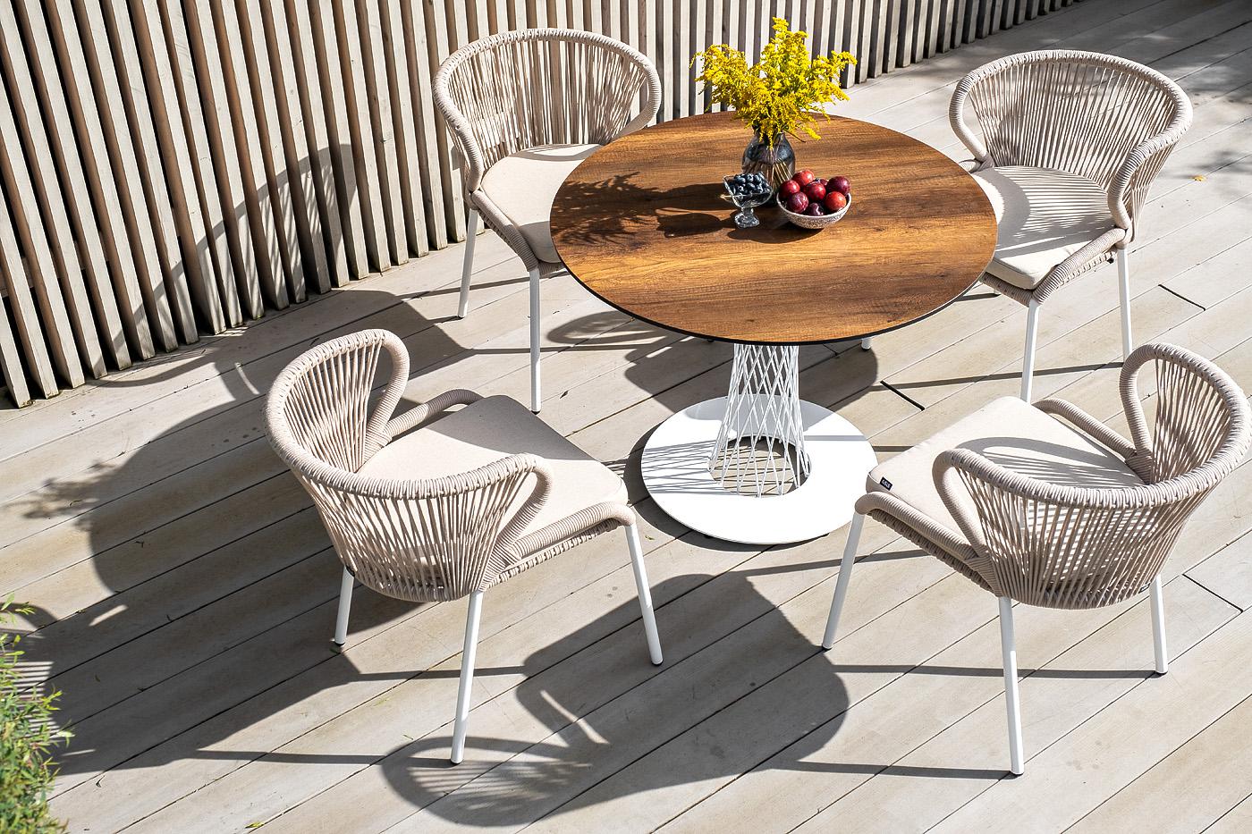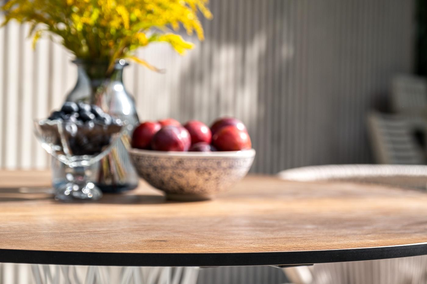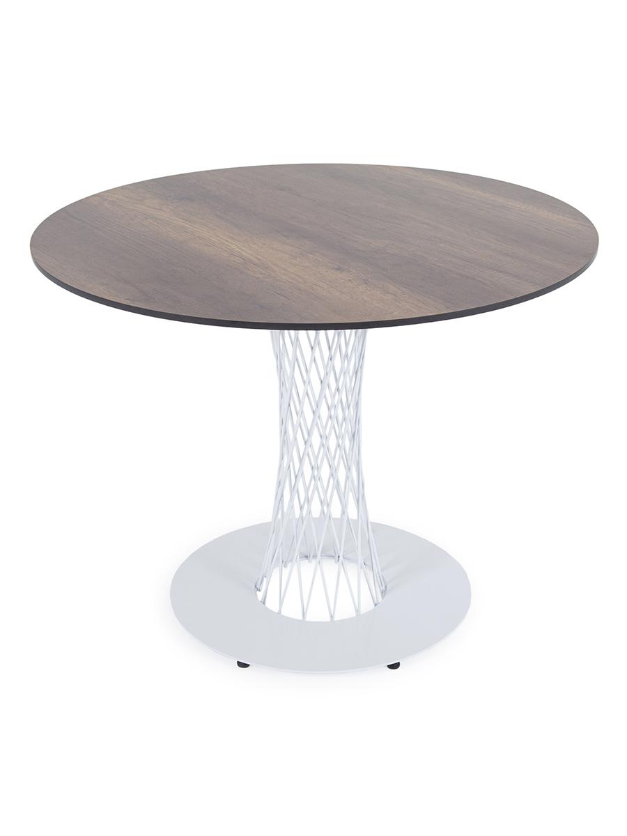 Круглый обеденный стол «Диего» с подстольем, произведенным посредством вертикального плетения из надежных металлических прутьев, выкрашенных в белый цвет. В качестве столешницы использован актуальный на сегодняшний день HPL-пластик, выполненной в цвете «дуб». Данный материал обладает стойкостью к механическим повреждениям, контакту с высокими температурами от кухонных предметов и к различным погодным условиям, что позволяет эксплуатировать не только в помещении. Диаметр поверхности - 100 см. В