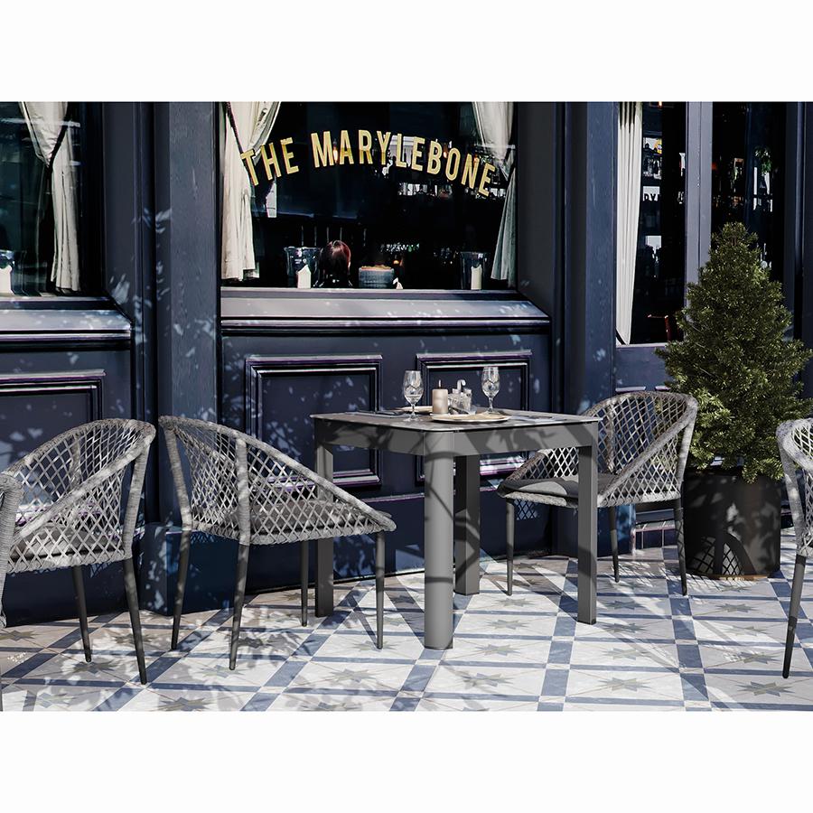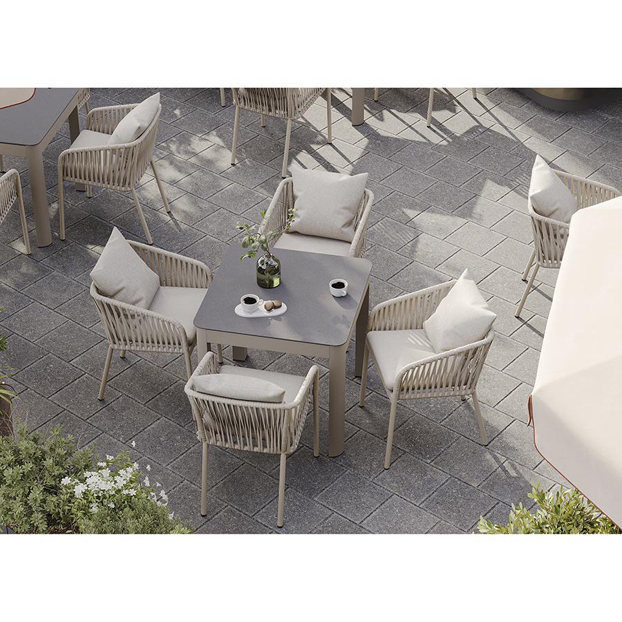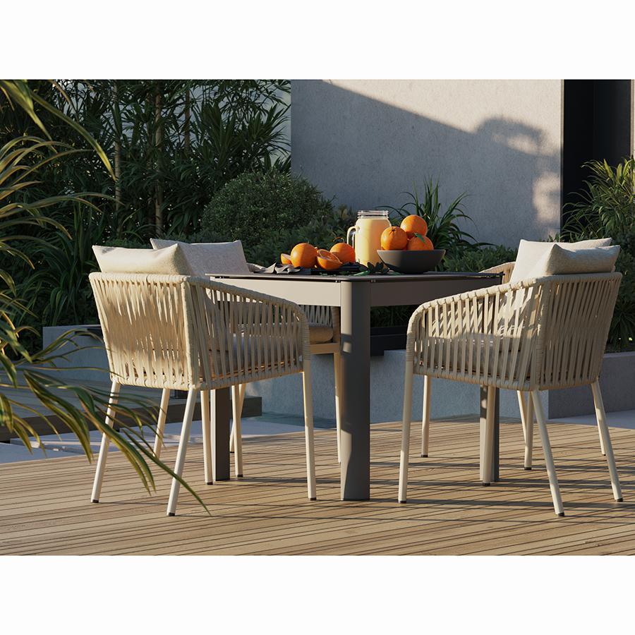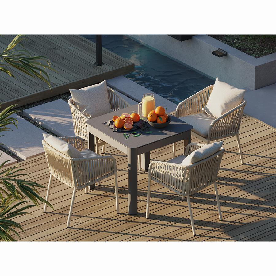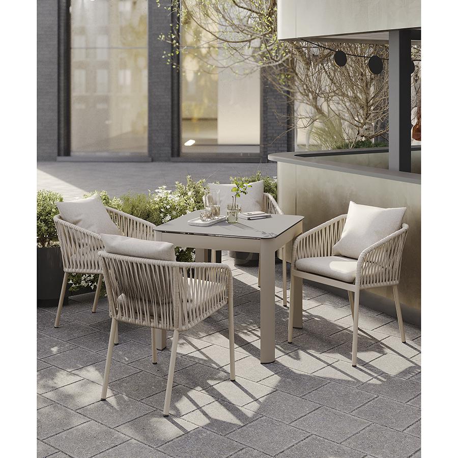 Стол обеденный Leif – прекрасный вариант для обустройства уютного пространства в зоне отдыха и приема пищи. Вы можете использовать этот предмет мебели не только в помещении, но и на открытой террасе или в саду, не беспокоясь о том, что он будет поврежден дождем, солнцем или влагой. Особенности и преимущества: - Покрытие голландской фирмы AkzoNobel, лидера в производстве покрытий для металлических изделий, обеспечивает мебели высокую износостойкость и возможность использования в уличных условиях. - Стол имеет прочный каркас из алюминиевой трубы толщиной 1,2 мм и 1,5 мм. - Круговая полная сварка по всей поверхности соприкосновения шва гарантирует конструкции надежность и долговечность. - Столешница из ударопрочного закаленного стекла толщиной 5 мм легко моется и долго сохраняет привлекательный вид. - Одна сторона столешницы шершавая, покрытая каменной крошкой для большей прочности, а вторая - гладкая. - Стол выдерживает нагрузку до 60 кг. - Гарантия на мебель – 12 месяцев. Материал: алюминий, закаленное кварцевое стекло. Размеры: 80х80х75 см. Расстояние между ножками: 76 см. Цвет: серо-бежевый. Столешницу рекомендуется протирать влажной тканью без длинных волокон – это поможет избежать оседания пыли и частиц текстиля. Запрещается применение абразивов и агрессивной бытовой химии.