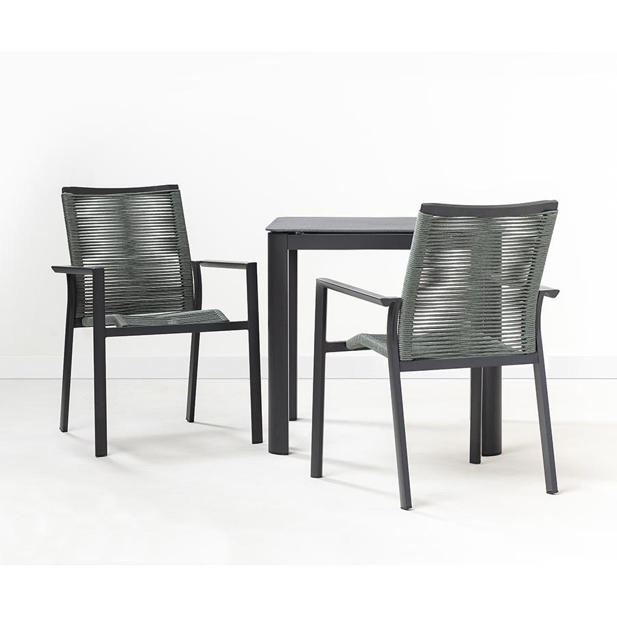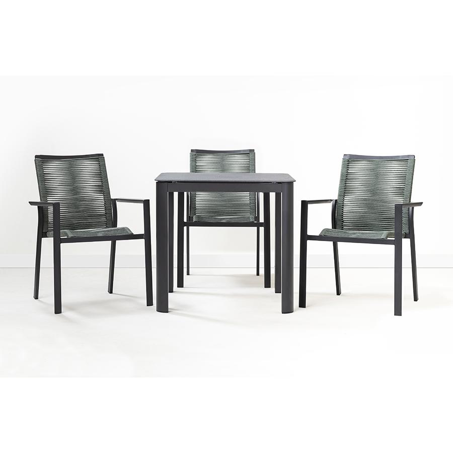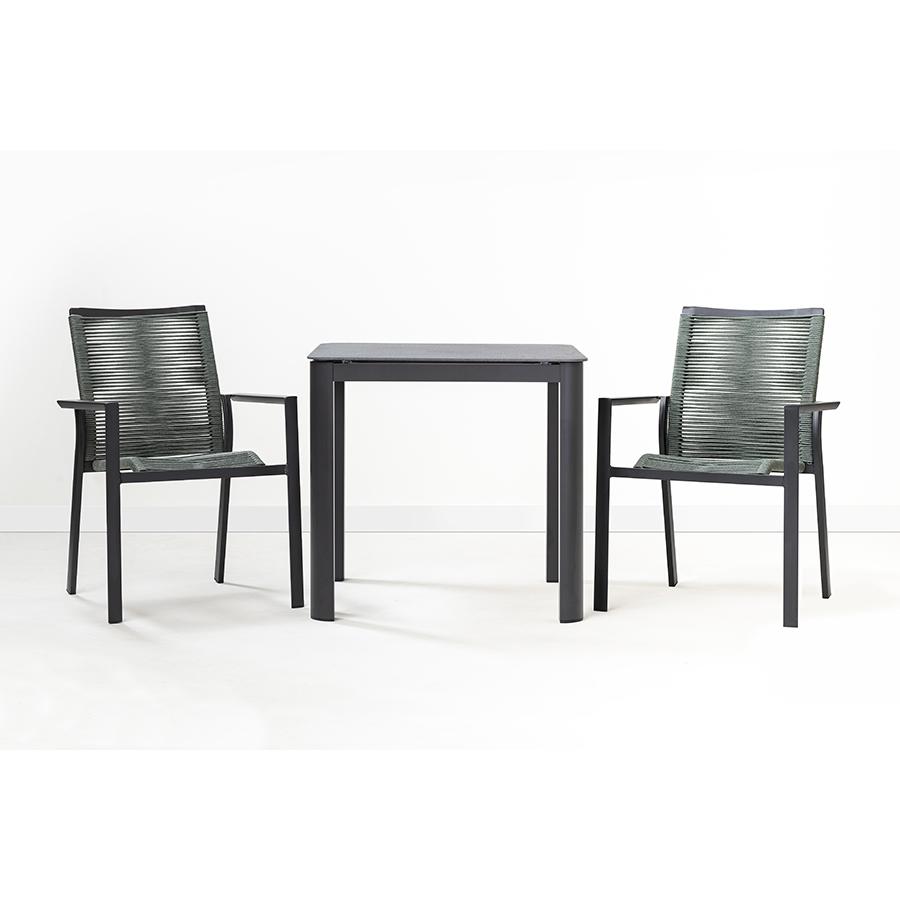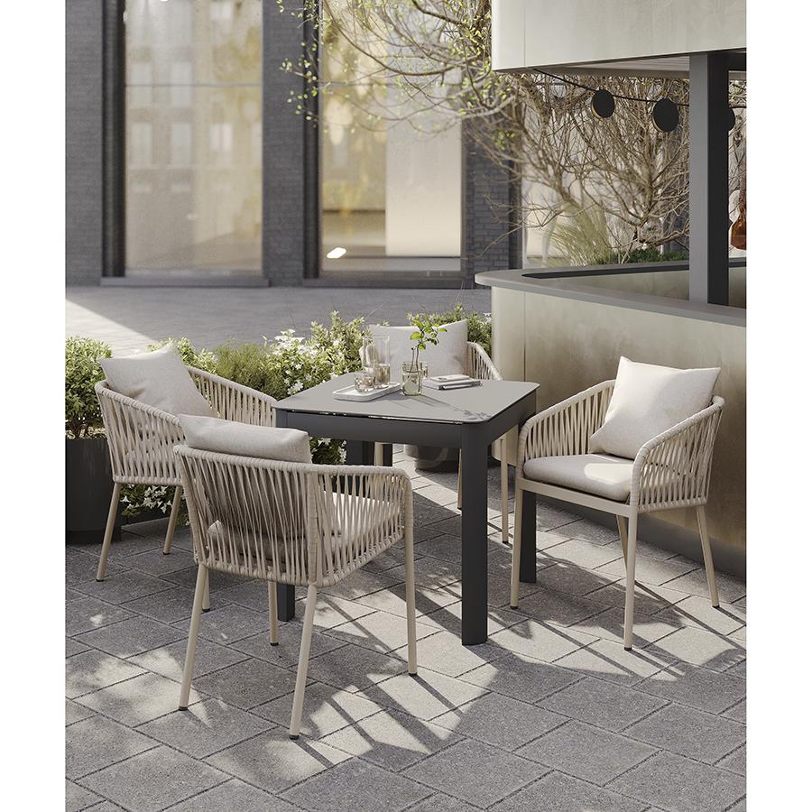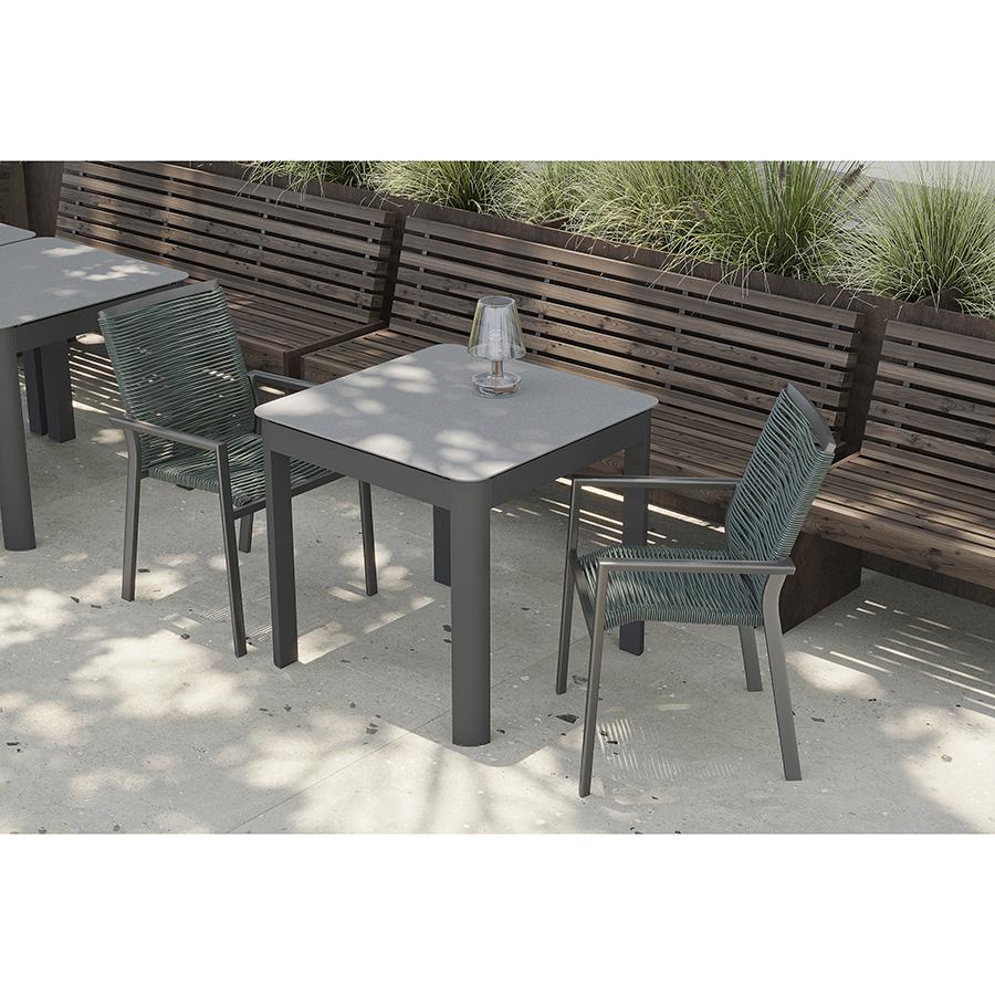 Стол обеденный Leif – прекрасный вариант для обустройства уютного пространства в зоне отдыха и приема пищи. Вы можете использовать этот предмет мебели не только в помещении, но и на открытой террасе или в саду, не беспокоясь о том, что он будет поврежден дождем, солнцем или влагой. Особенности и преимущества: - Покрытие голландской фирмы AkzoNobel, лидера в производстве покрытий для металлических изделий, обеспечивает мебели высокую износостойкость и возможность использования в уличных условиях. - Стол имеет прочный каркас из алюминиевой трубы толщиной 1,2 мм и 1,5 мм. - Круговая полная сварка по всей поверхности соприкосновения шва гарантирует конструкции надежность и долговечность. - Столешница из ударопрочного закаленного стекла толщиной 5 мм легко моется и долго сохраняет привлекательный вид. - Одна сторона столешницы шершавая, покрытая каменной крошкой для большей прочности, а вторая - гладкая. - Стол выдерживает нагрузку до 60 кг. - Гарантия на мебель – 12 месяцев. Материал: алюминий, закаленное кварцевое стекло. Размеры: 80х80х75 см. Расстояние между ножками: 76 см. Цвет: темно-серый. Столешницу рекомендуется протирать влажной тканью без длинных волокон – это поможет избежать оседания пыли и частиц текстиля. Запрещается применение абразивов и агрессивной бытовой химии.