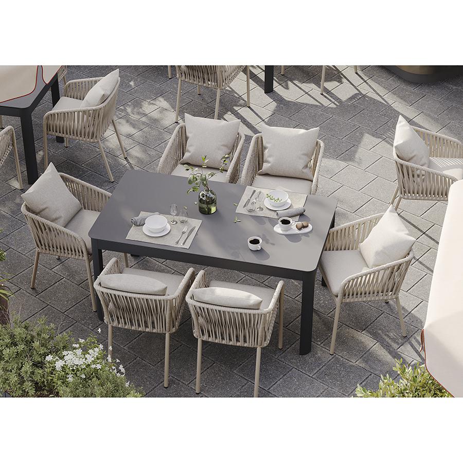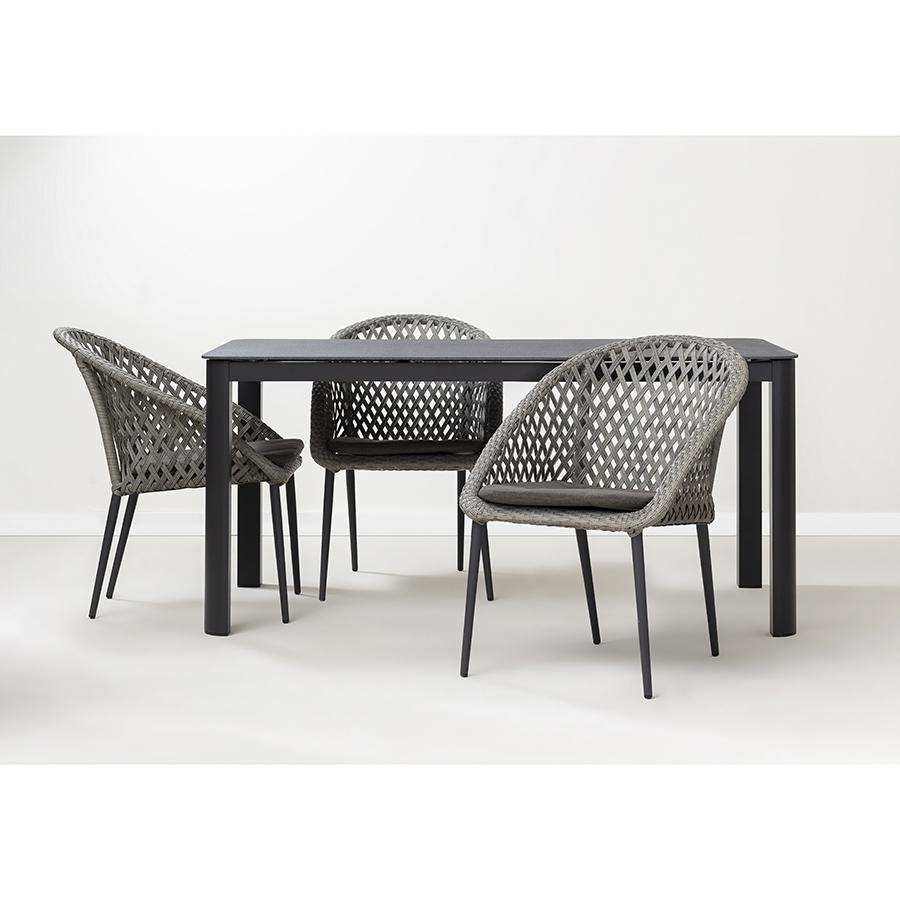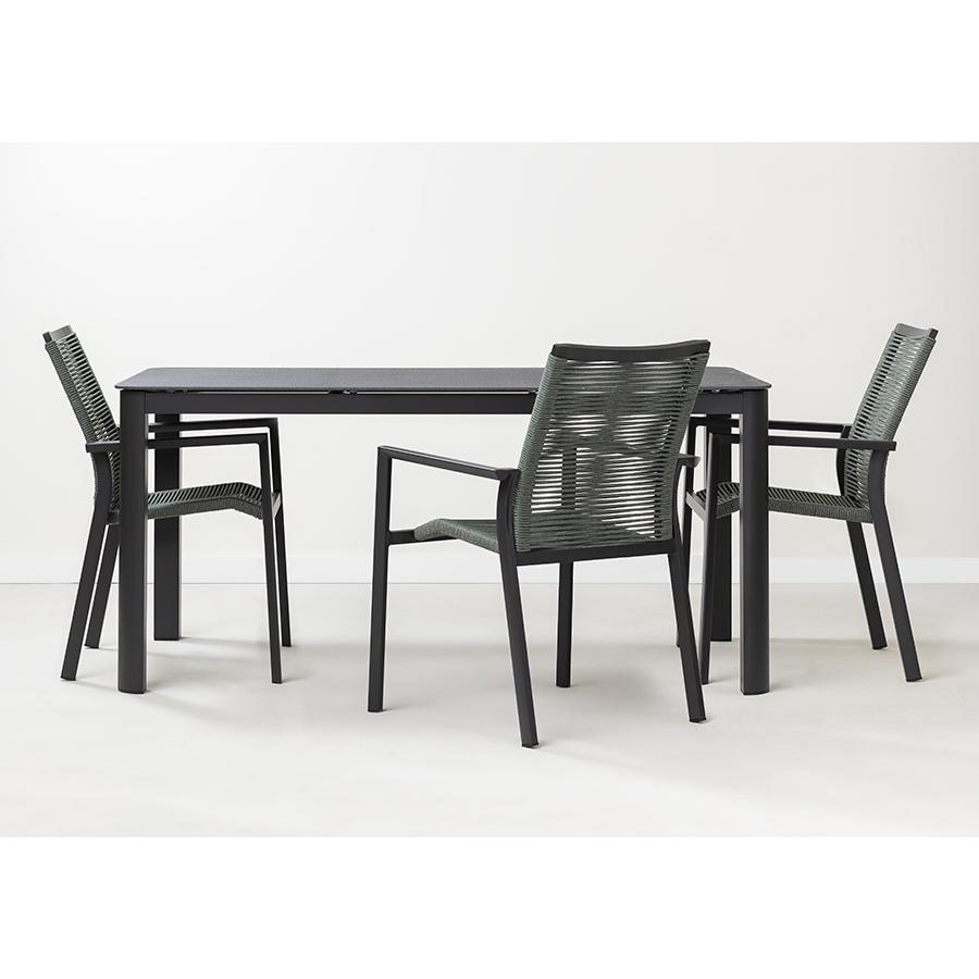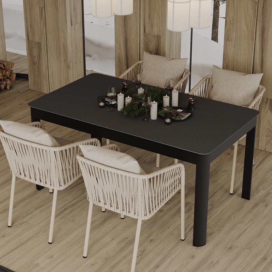 Стол обеденный Leif – прекрасный вариант для обустройства уютного пространства в зоне отдыха и приема пищи. Вы можете использовать этот предмет мебели не только в помещении, но и на открытой террасе или в саду, не беспокоясь о том, что он будет поврежден дождем, солнцем или влагой. Особенности и преимущества: - Покрытие голландской фирмы AkzoNobel, лидера в производстве покрытий для металлических изделий, обеспечивает мебели высокую износостойкость и возможность использования в уличных условиях. - Стол имеет прочный каркас из алюминиевой трубы толщиной 1,2 мм и 1,5 мм. - Круговая полная сварка по всей поверхности соприкосновения шва гарантирует конструкции надежность и долговечность. - Столешница из ударопрочного закаленного стекла толщиной 5 мм легко моется и долго сохраняет привлекательный вид. - Одна сторона столешницы шершавая, покрытая каменной крошкой для большей прочности, а вторая - гладкая. - Стол выдерживает нагрузку до 60 кг. - Гарантия на мебель – 12 месяцев. Материал: алюминий, закаленное кварцевое стекло. Размеры: 160х90х75 см. Расстояние между ножками: 87 см и 157 см. Цвет: темно-серый. Столешницу рекомендуется протирать влажной тканью без длинных волокон – это поможет избежать оседания пыли и частиц текстиля. Запрещается применение абразивов и агрессивной бытовой химии.