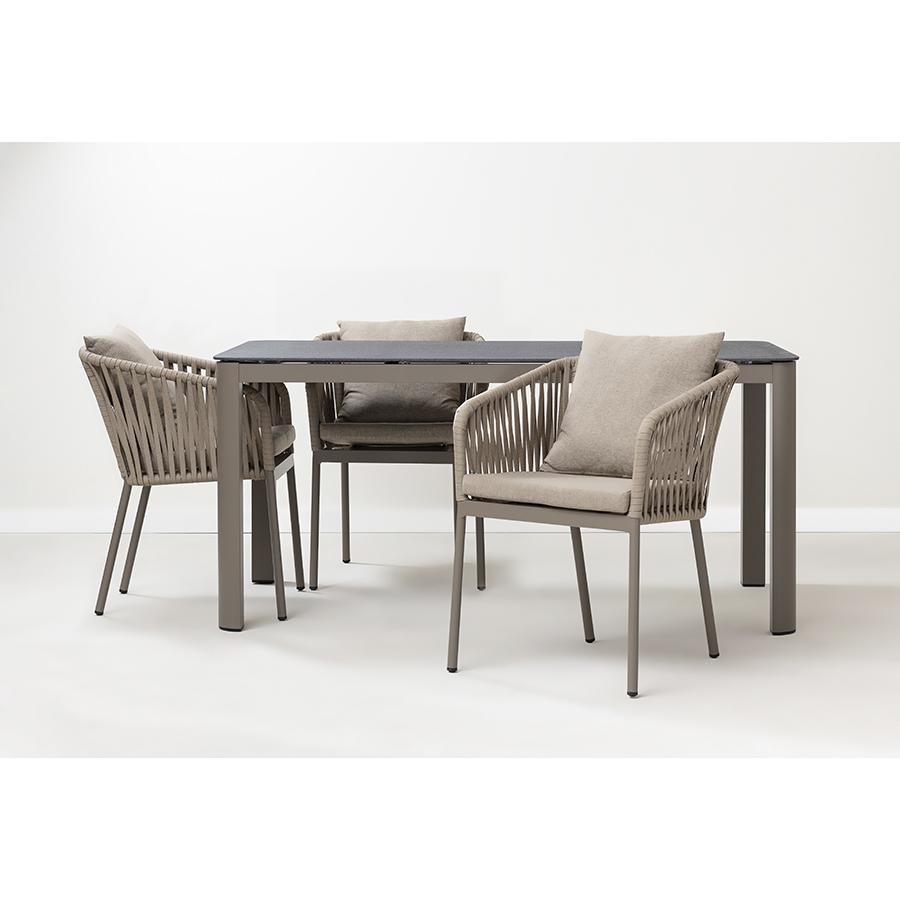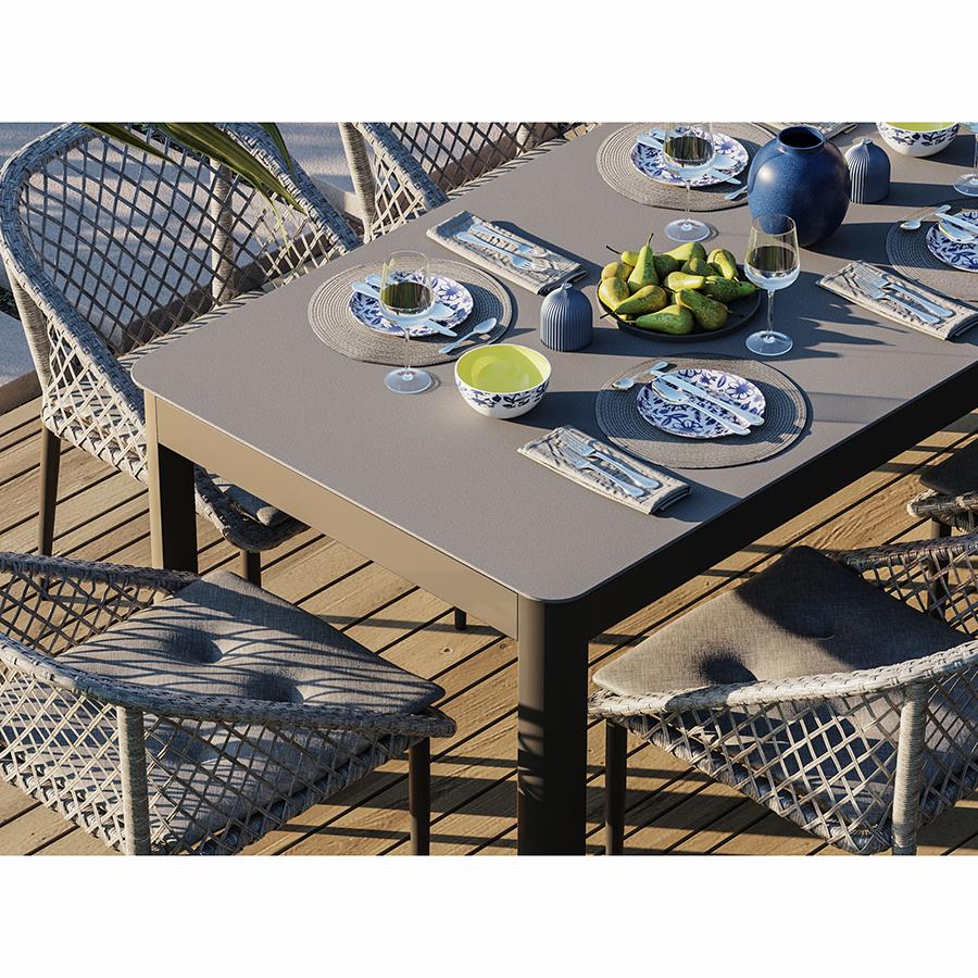 Стол обеденный Leif – прекрасный вариант для обустройства уютного пространства в зоне отдыха и приема пищи. Вы можете использовать этот предмет мебели не только в помещении, но и на открытой террасе или в саду, не беспокоясь о том, что он будет поврежден дождем, солнцем или влагой. Особенности и преимущества: - Покрытие голландской фирмы AkzoNobel, лидера в производстве покрытий для металлических изделий, обеспечивает мебели высокую износостойкость и возможность использования в уличных условиях. - Стол имеет прочный каркас из алюминиевой трубы толщиной 1,2 мм и 1,5 мм. - Круговая полная сварка по всей поверхности соприкосновения шва гарантирует конструкции надежность и долговечность. - Столешница из ударопрочного закаленного стекла толщиной 5 мм легко моется и долго сохраняет привлекательный вид. - Одна сторона столешницы шершавая, покрытая каменной крошкой для большей прочности, а вторая - гладкая. - Стол выдерживает нагрузку до 60 кг. - Гарантия на мебель – 12 месяцев. Материал: алюминий, закаленное кварцевое стекло. Размеры: 160х90х75 см. Расстояние между ножками: 87 см и 157 см. Цвет: серо-бежевый. Столешницу рекомендуется протирать влажной тканью без длинных волокон – это поможет избежать оседания пыли и частиц текстиля. Запрещается применение абразивов и агрессивной бытовой химии.