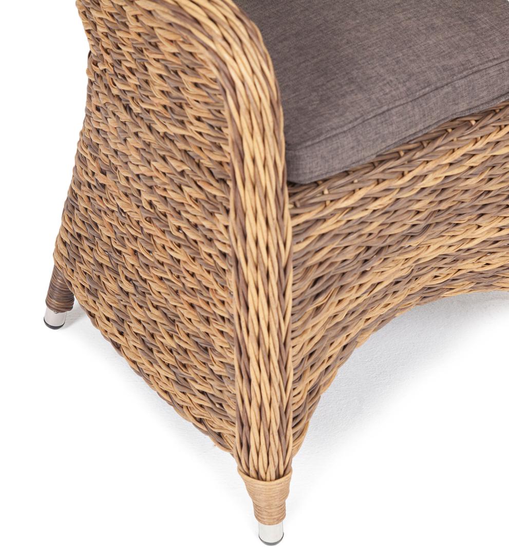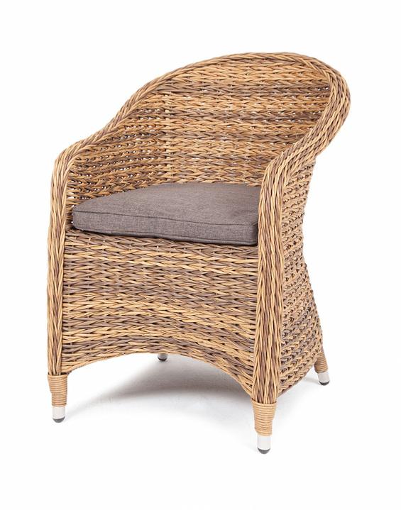Кресло для сада из искусственного ротанга c плетением вида «гиацинт» из коллекции «Равенна» станет поистине украшением вашего сада, веранды или террасы. Его можно использовать в помещении и на улице. Кресло изготовлено посредством ручного плетения соломенного цвета. Для укрепления конструкции использован алюминиевый каркас. Благодаря ему плетеное кресло остается легким, но прочным. Модель способна выдержать до 150 кг. Размеры: 570×680×810 мм. В комплект включена серая подушка со съёмны