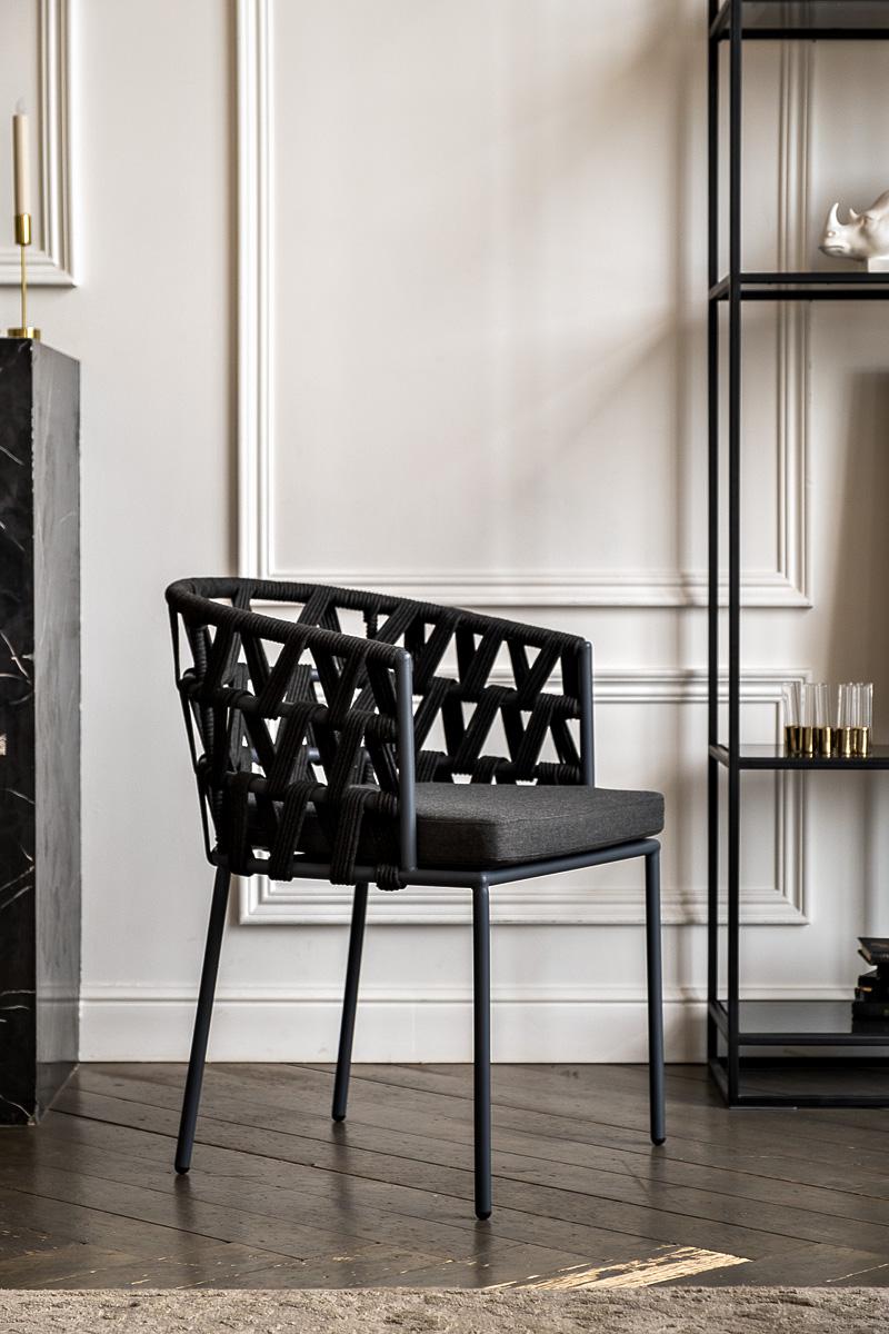 Стул «Диего» изготовлен из стального каркаса, окрашенного порошковой износостойкой краской серого (RAL7022) цвета. Каркас вручную оплетен темно-серым роупом - эластичными синтетическими лентами из высокопрочных полиэфирных волокон. В комплект входит подушка со съёмным чехлом из 100% влагоотталкивающего полиэстера темно-серого цвета. Размер плетеного стула: 530×620×740 мм.