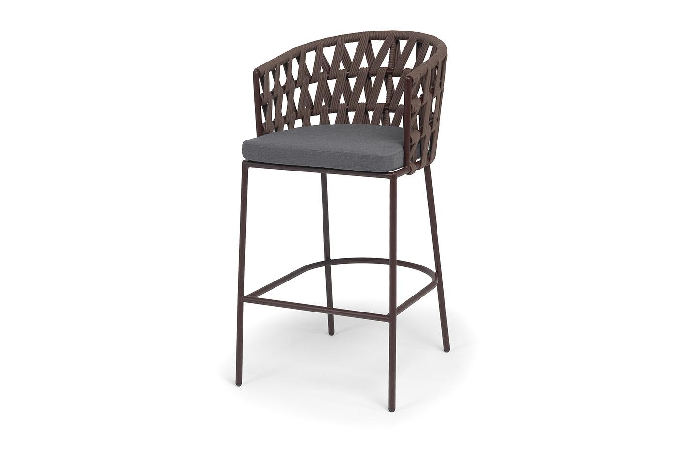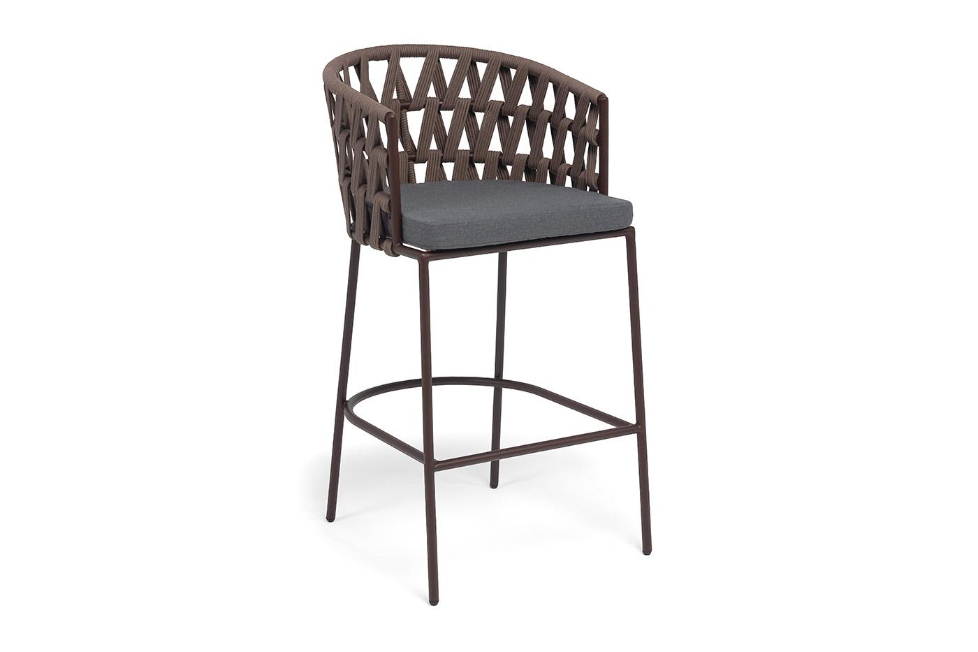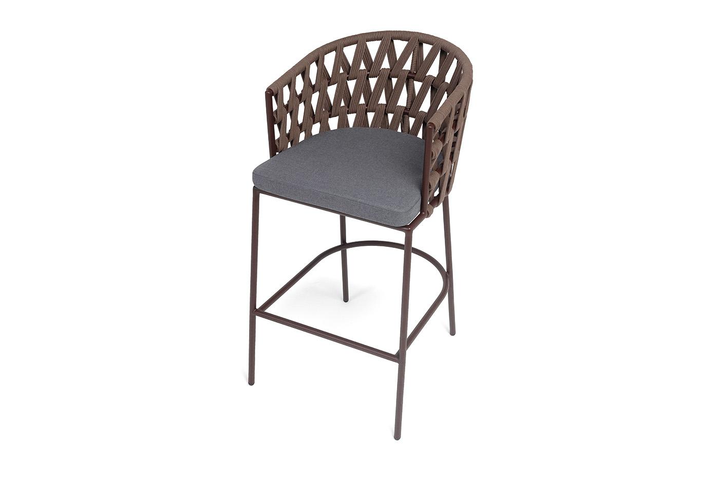 Стул барный «Диего» изготовлен из стального каркаса, окрашенного порошковой износостойкой краской коричневого цвета. Каркас вручную оплетен коричневым роупом - эластичными синтетическими лентами из высокопрочных полиэфирных волокон. В комплект входит подушка со съ`мным чехлом из 100% влагоотталкивающего полиэстера темно-серого цвета. Размер плетеного стула: хх мм.