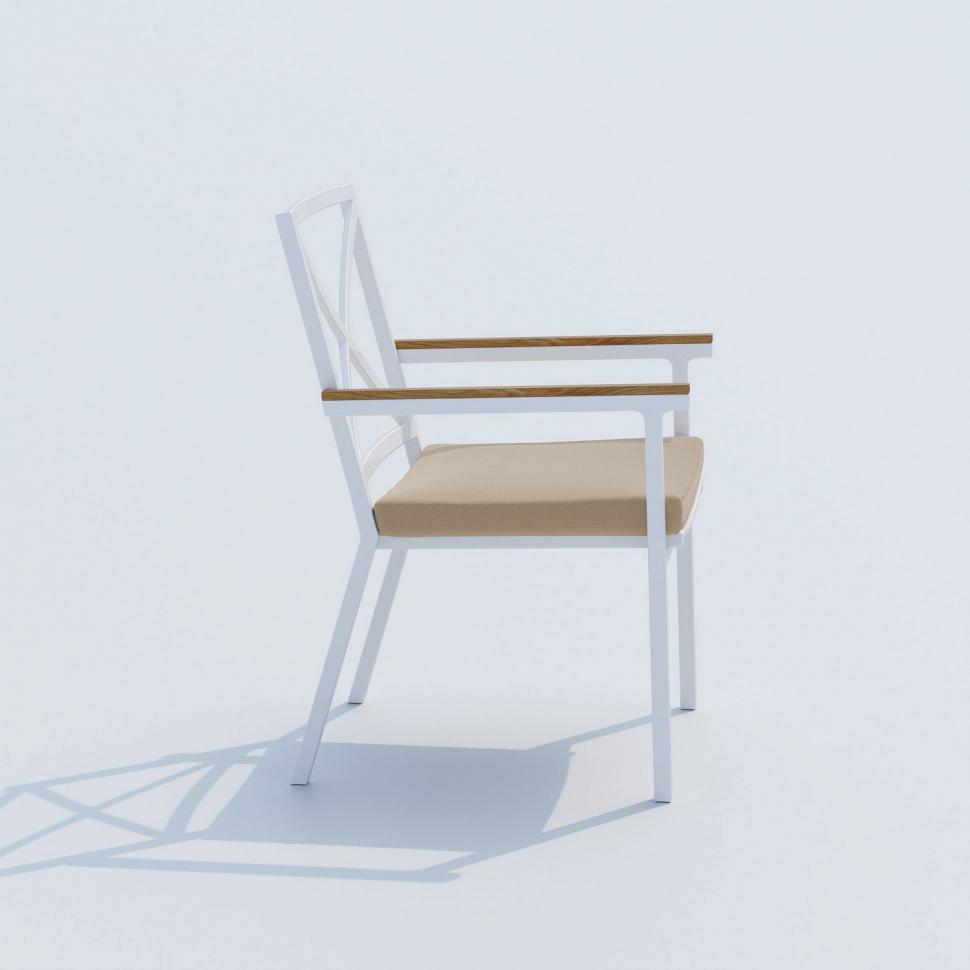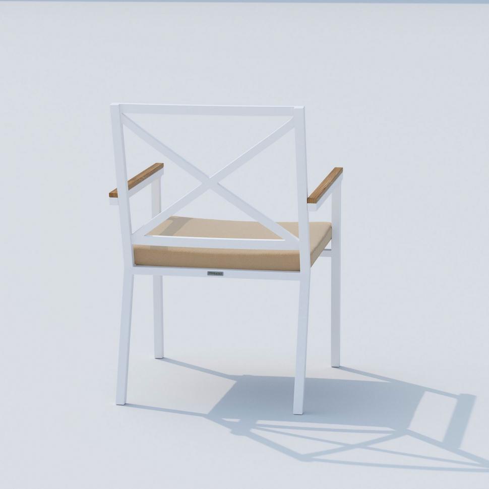 Материалы: всесезонный алюминий, ткань для улицы, тик Габариты: Ш 57 * Г 60 * В 86 Цвет: каркас белый / подушка бежевая Особенности: подлокотники из тика,съемный чехол на "молнии"