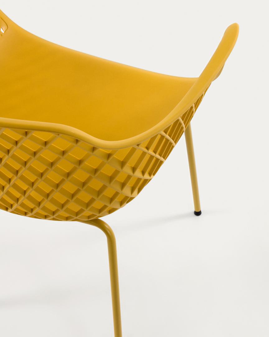 Стул-кресло Quinn от фабрики La Forma (ex Julia Grup) – многоцелевое изделие, которое идеально подходит для дома или улицы. Стул-кресло Quinn по-современному практичное и абсолютно универсальное в дизайне. Эта модель одинаково хорошо будет смотреться как у вас дома, так и в общественном месте в помещении или на улице. Стул отлично гармонирует с любой мебелью. Он практичный и удобный. Это красивая базовая модель для вашей террасы, не сомневайтесь. Модель Quinn представлена в трех цветах – белом, желтом, темно-сером. Сиденье сделано из прочного пластика (полипропилен), который не портится от влаги, быстро сохнет за счет сетчатой структуры, легко очищается от загрязнений. Спинка плавно переходит в подлокотники, имеет дугообразную форму. Все это обеспечивает комфорт, позволяет дополнить сиденье подушкой или пледом. Опора с ножками сделаны из металла, покрыты порошковой краской для защиты от негативного влияния внешней среды. Ножки трубчатые, высотой 45 см. Они имеют пластиковые наконечники, которые улучшают устойчивость стула на неровной поверхности. Максимально допустимая нагрузка – 150 кг. Размеры: ширина – 60 см, высота – 80 см, глубина – 55 см, глубина сиденья – 40 см. Вес – 4,7 кг. Сборка не требуется.