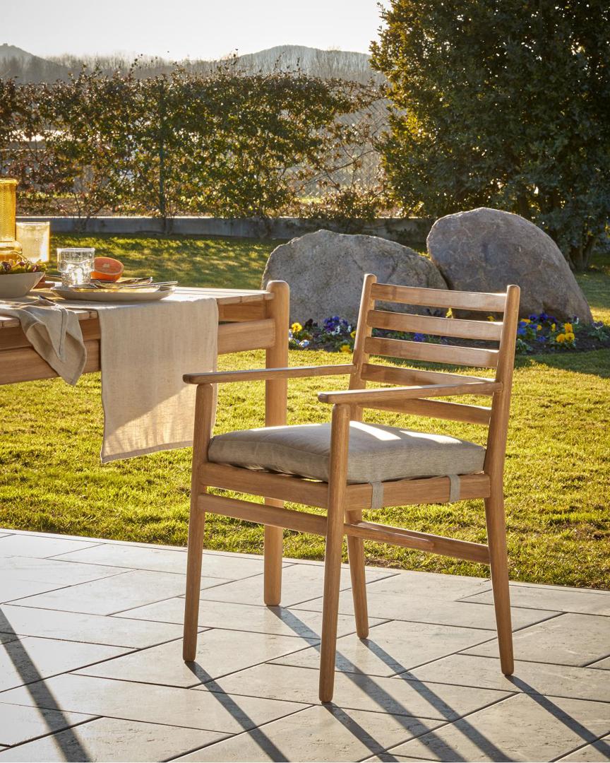 Стул Simja от фабрики La Forma (ex Julia Grup) – цельная эвкалиптовая структура для аутентичного уличного интерьера. Стул Simja – это ценность древесной породы и уникальность тонов и зерен. Такая модель несомненно создаст уютную и лаконичную обстановку на вашей террасе или другой уличной зоне отдыха. Комфорт обеспечит мягкая подушка, а прочность древесной породы – многолетнюю эксплуатацию. Стул полностью сделан из натурального дерева – эвкалипта. Эта порода отличается природной прочностью, эффектно контрастной тональностью вершин и зерен. Для защиты от ультрафиолета и влажности дерево покрыто полиуретаном. Ножки шириной 4 см оснащены пластиковыми наконечниками, которые помогают добиться устойчивости на неровной поверхности. Спинка имеет реечную структуру, с шириной перекладин по 4 см. Сиденье с подушкой высотой 5 см. Она набита пеной плотностью 25 кг/м3. Гипоаллергенный тканевый чехол (100 % полиэстер) серого цвета. Он съемный, имеет защитную пропитку от ультрафиолета. Общая максимальная нагрузка на стул не должна превышать 130 кг Вес изделия – 5,5 кг. Размеры: ширина – 55 см, высота – 82 см, глубина – 54 см, высота сиденья – 50 см, Сборка не требуется.