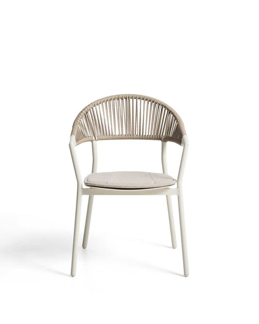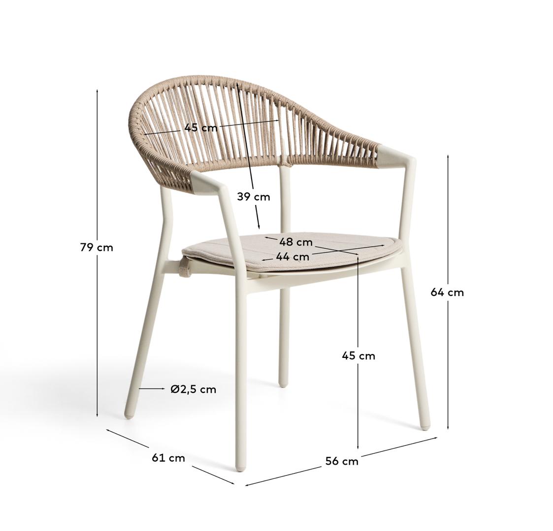 Стул Alimia сочетает в себе легкость и долговечность. Его алюминиевая структура устойчива к ржавчине, коррозии и воздействию солнца. Сплинка соткана вручную из синтетического шнура, добавляя текстуру и визуальный комфорт. Включает в себя подушку сиденья для дополнительного комфорта, которую мы рекомендуем хранить в дождливые дни. Его штабелируемая конструкция оптимизирует пространство, когда он не используется, а ножки оснащены пластиковыми ограждениями, которые помогают защитить пол и поддерживать поверхности в хорошем состоянии.