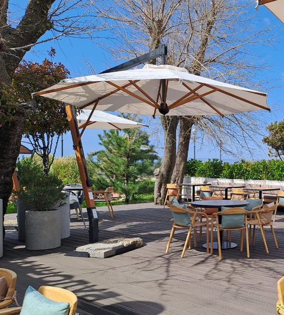 Благодаря используемым материалам и техническим устройствам изделия особенно прочны и подходят для интенсивного и профессионального использования. Использование водонепроницаемых акриловых тканей, обработанных деревом, сталью и алюминием, гарантирует долгий срок службы.
