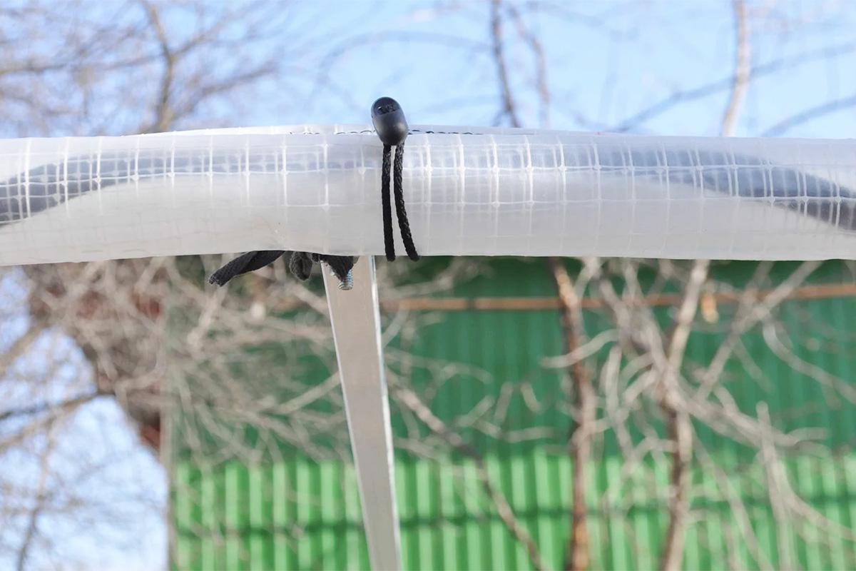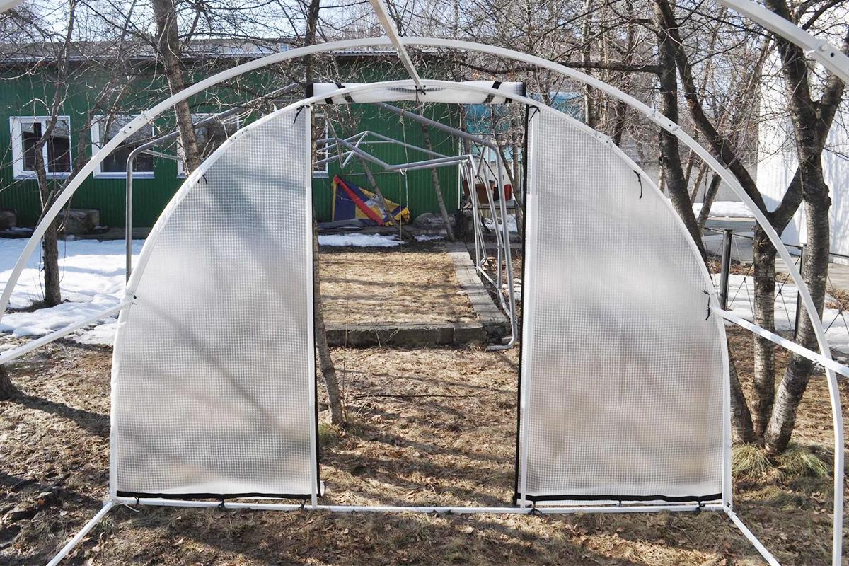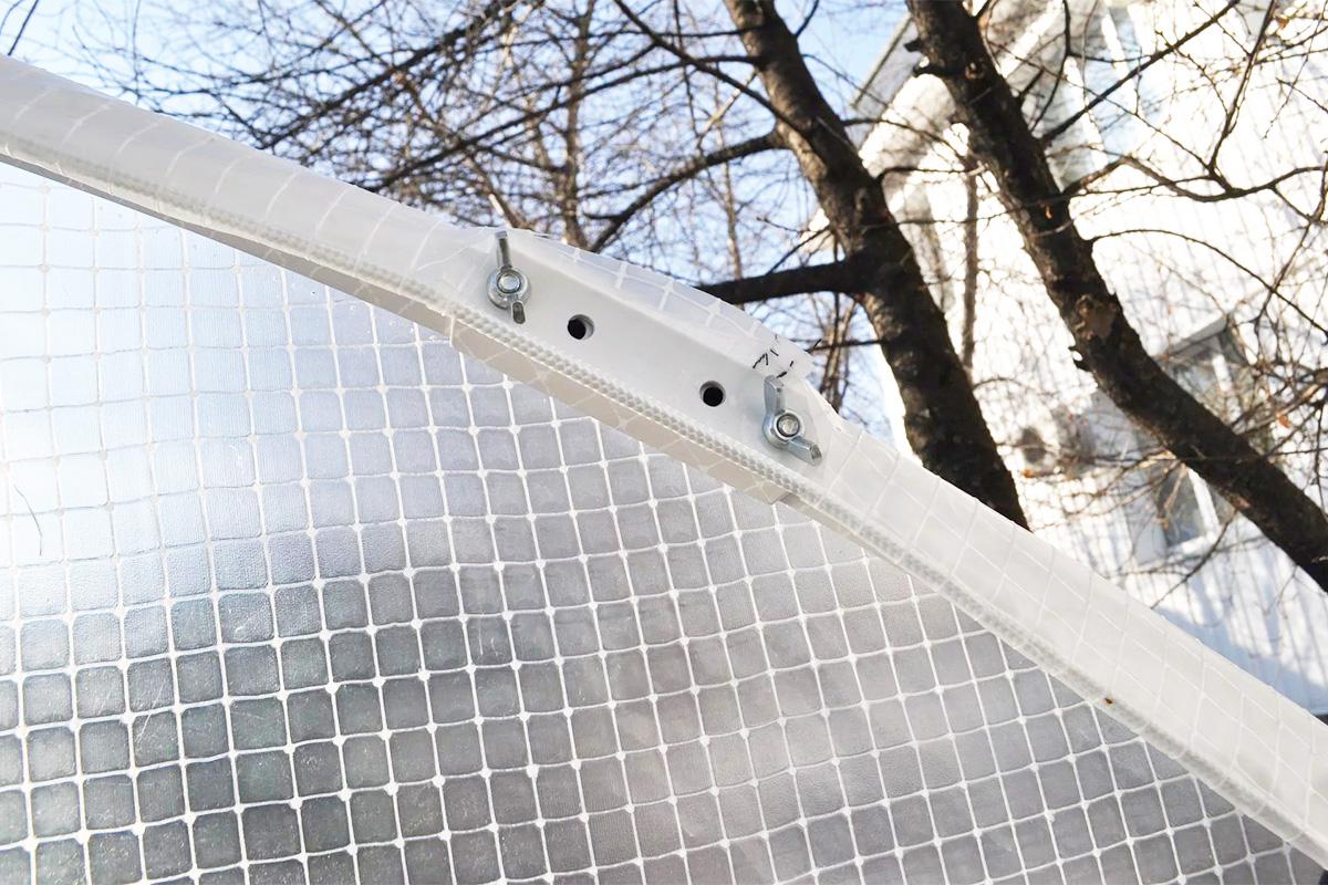 Мобильная. Не требуется фундамент - в любой момент можно перенести на новое место дислокации.Съёмное покрытие. Армированная пленка снимается на зиму, что благоприятно влияет на плодородие почвы - она напитывается влагой, не пересыхает, а микроорганизмы не вымирают. В жаркую погоду покрытие снизу можно подогнуть или снять совсем.