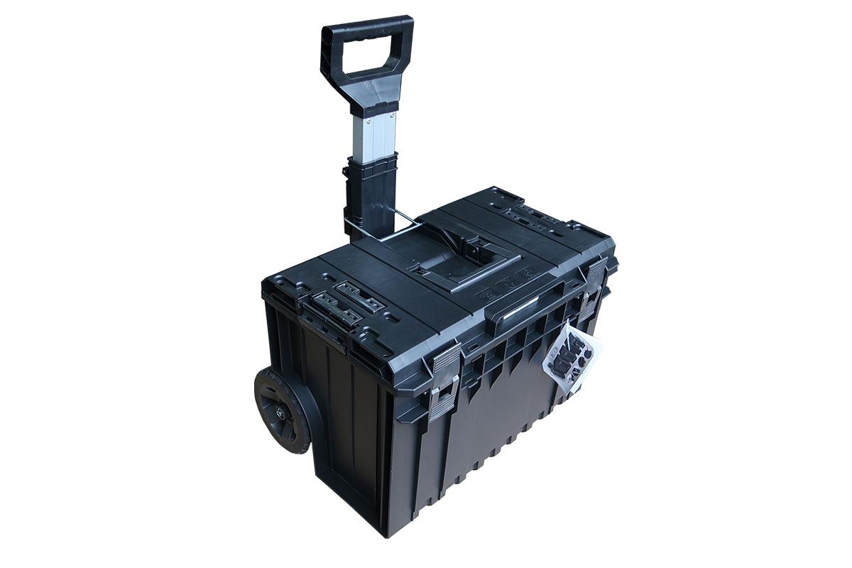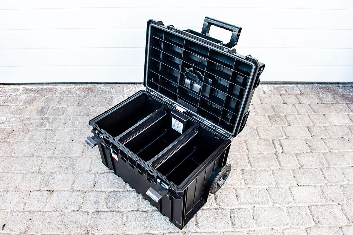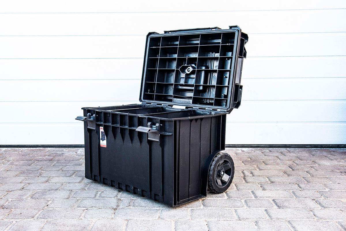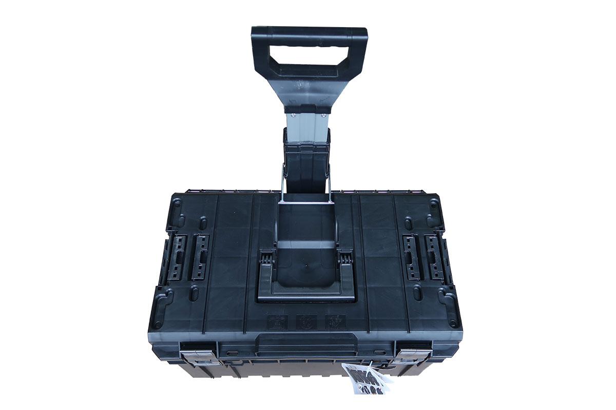 Два колеса с резиновым покрытием, установленные на металлической оси, позволяют безопасно транспортировать даже большие наборы. Телескопическая ручка, которая отклоняется при открытии крышки, обеспечивает удобный доступ к внутренней части ящика.