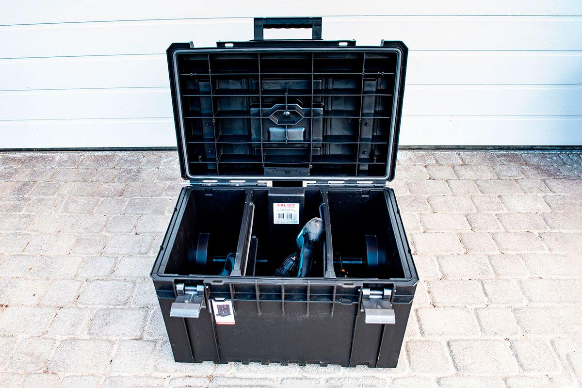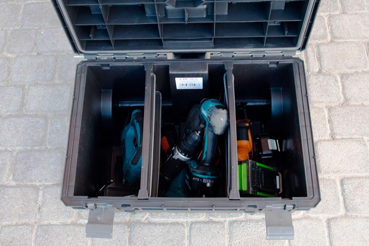 Объем ящика позволяет разместить большие электро- и ручные инструменты. Ящик оснащен гибкой прокладкой, которая обеспечивает полную защиту от попадания пыли и воды, и две регулируемые перегородки внутри ящика.