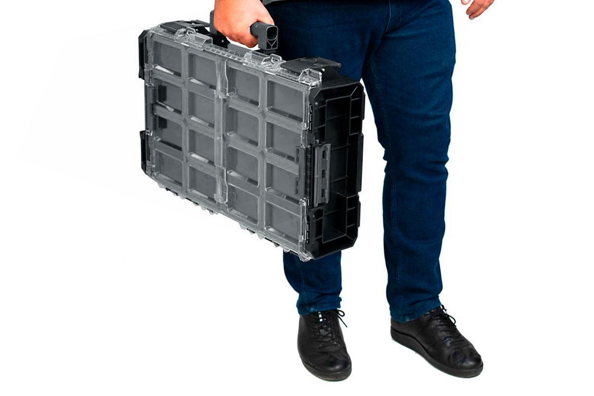 Органайзер ХL оснащен 12-ю съемными контейнерами.Крышка защищена от попадания воды и пыли с помощью гибкой прокладки, установленной в поликарбонатной крышке.