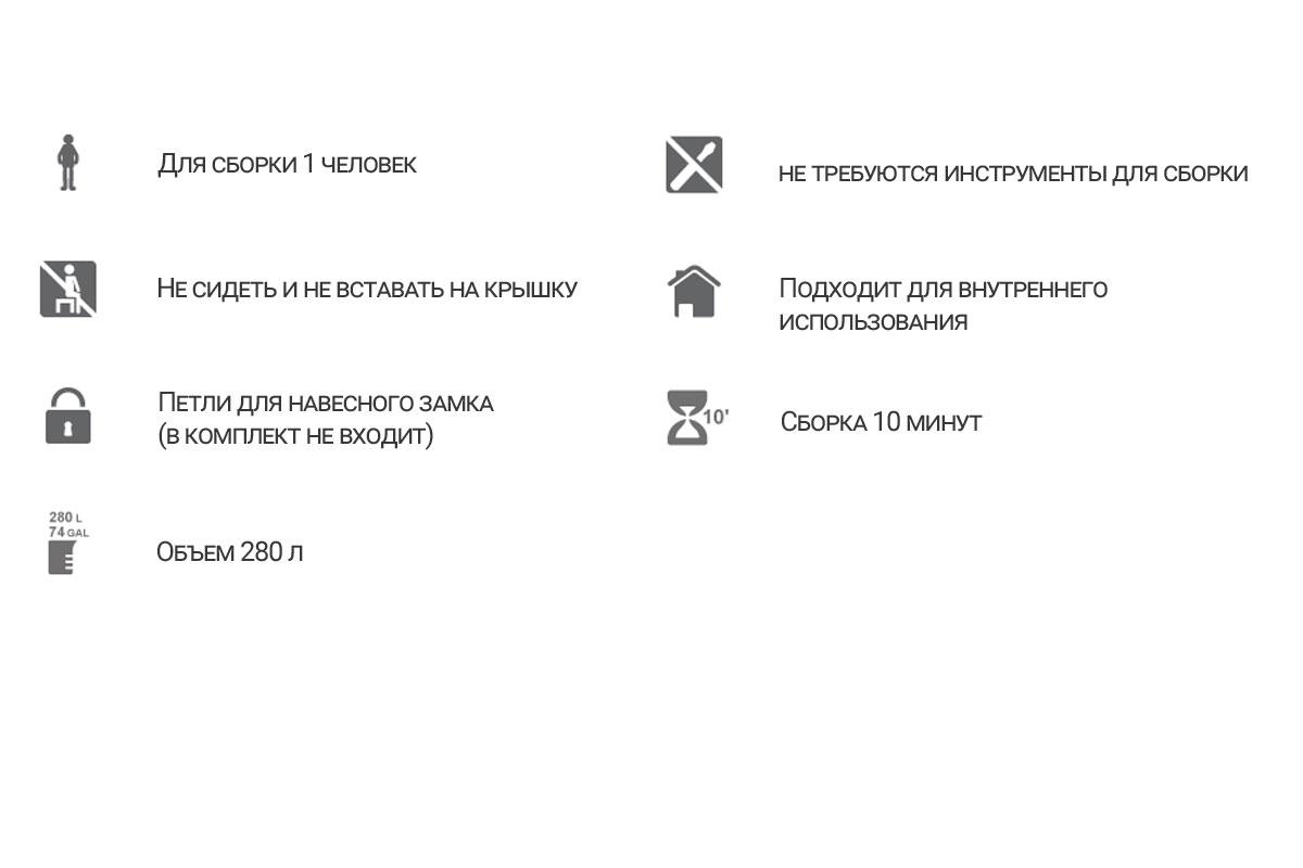 Сундук достаточно прочный для внешних нагрузок, но использовать в качестве скамейки - НЕЛЬЗЯ. Имеются колесики для удобства перемещения, сборно-разборный, компактный в перевозке. Ручки для переноски. Предусмотрены отверстия для навесного замка.