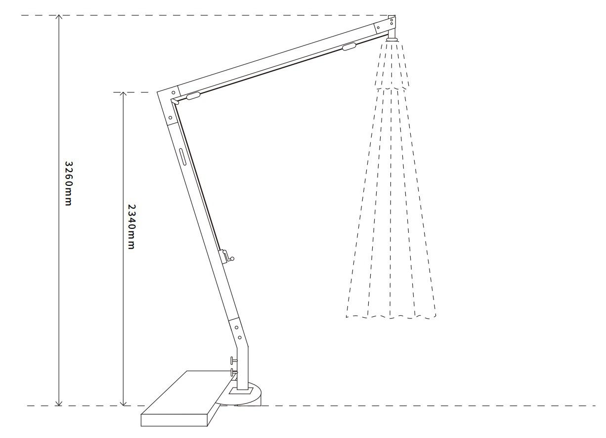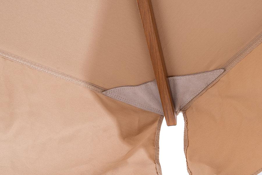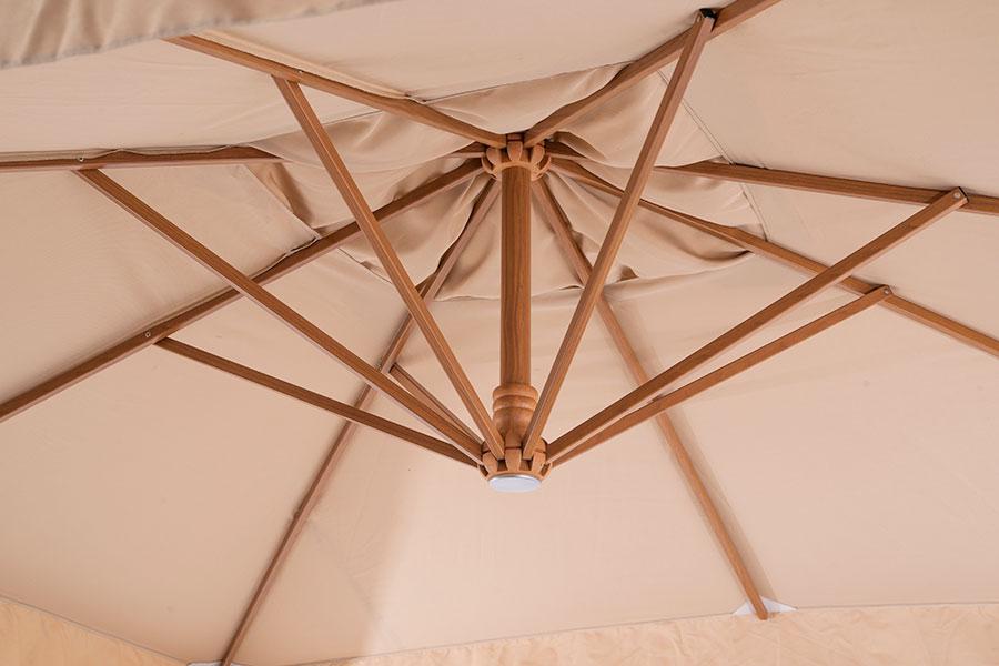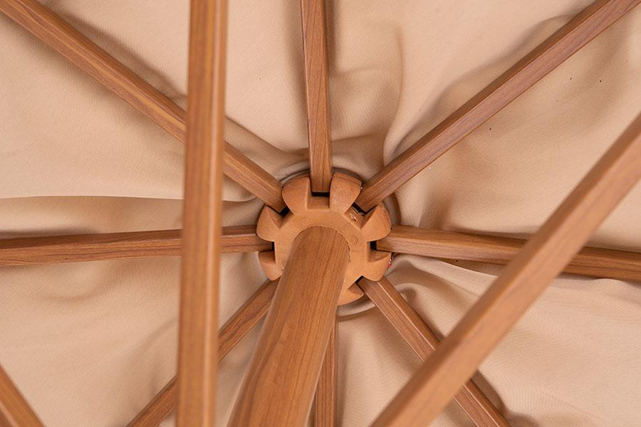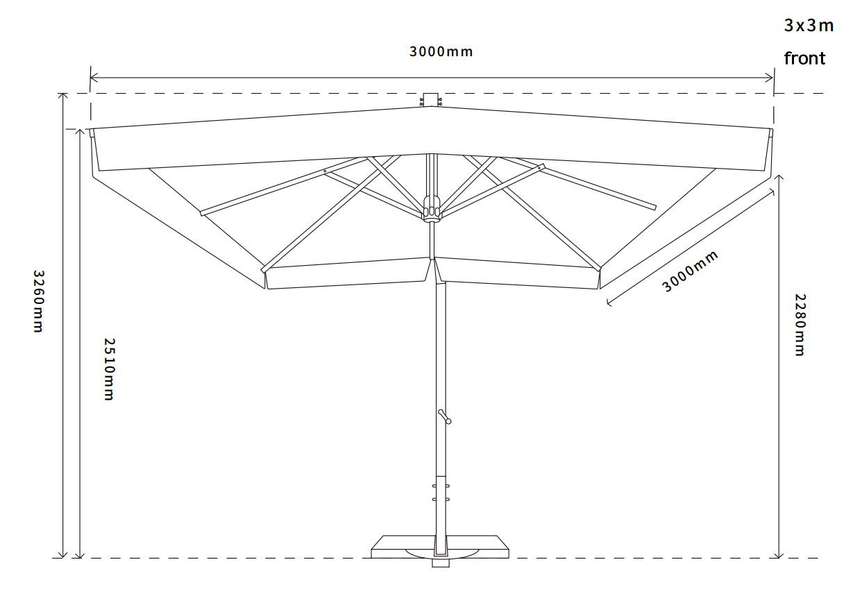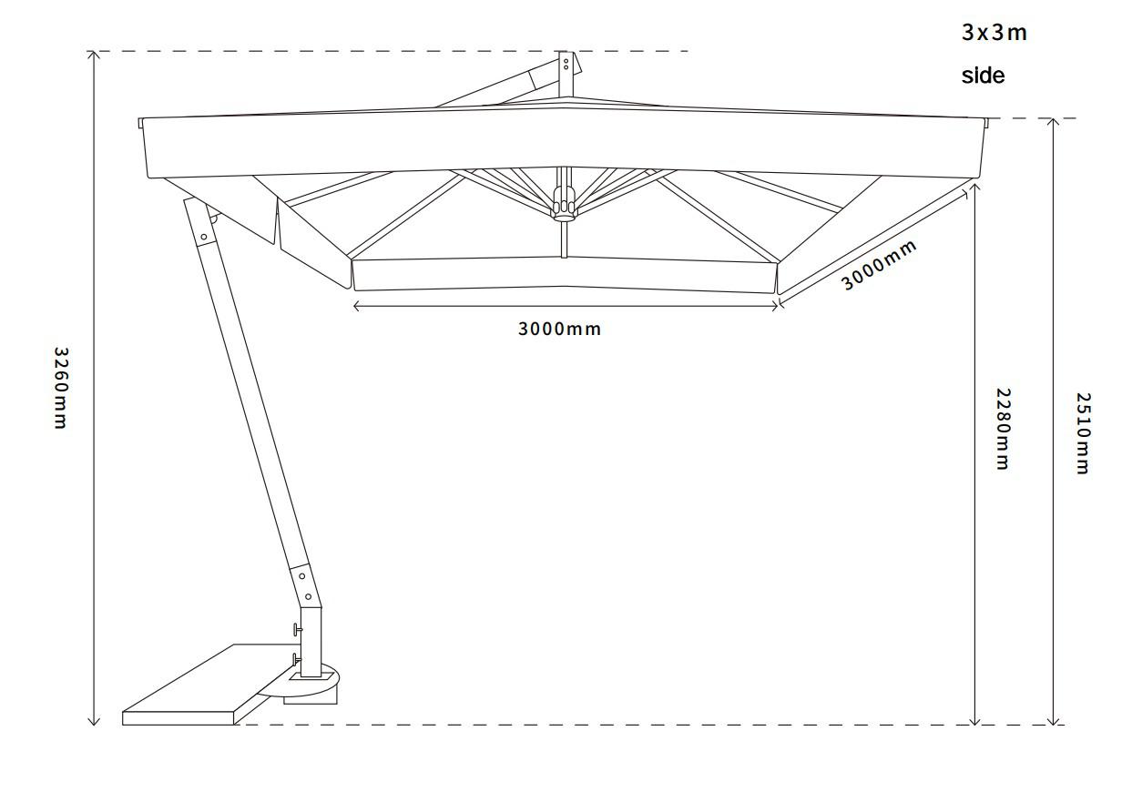 Уличный зонт «Корсика» на боковой алюминиевой опоре с размером купола 3×3 м. Зонт состоит из восьми алюминиевых спиц и алюминиевой боковой опоры из двух частей, соединенных стальной основой. Длина спиц: 209 см - 4 шт. и 149,7 см - 4 шт. Толщина опоры - 64×64 мм, длина нижней части - 210 см, верхней - 200 см. Опора имеет декоративную отделку с анодированным покрытием в цвет дерева. Общая высота зонта - 326 см, высота от земли до нижнего края купола - 228 см. Зонт также оснащен механизмом раскрыт