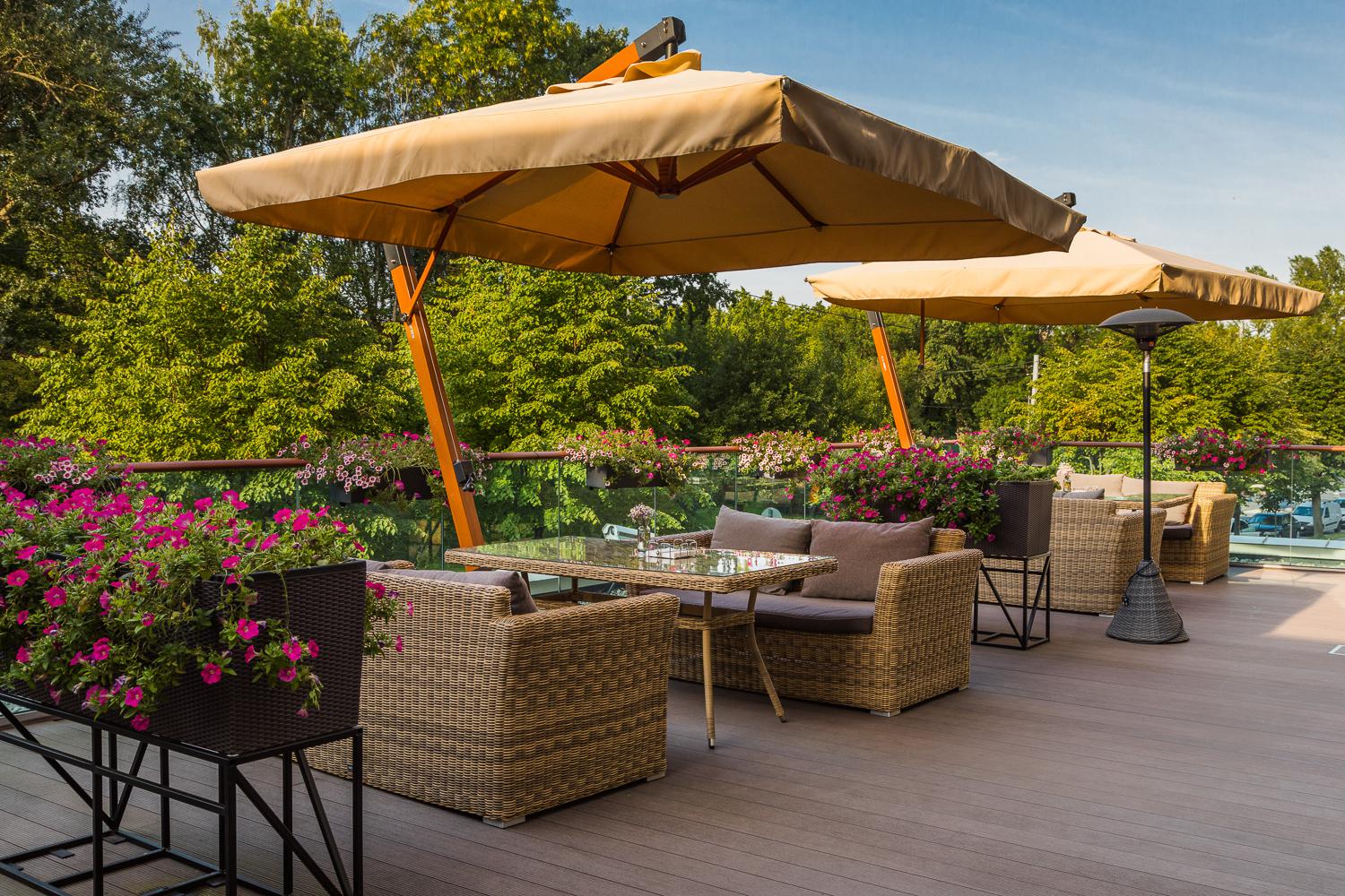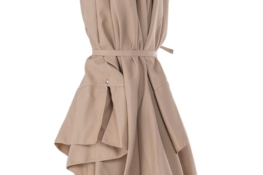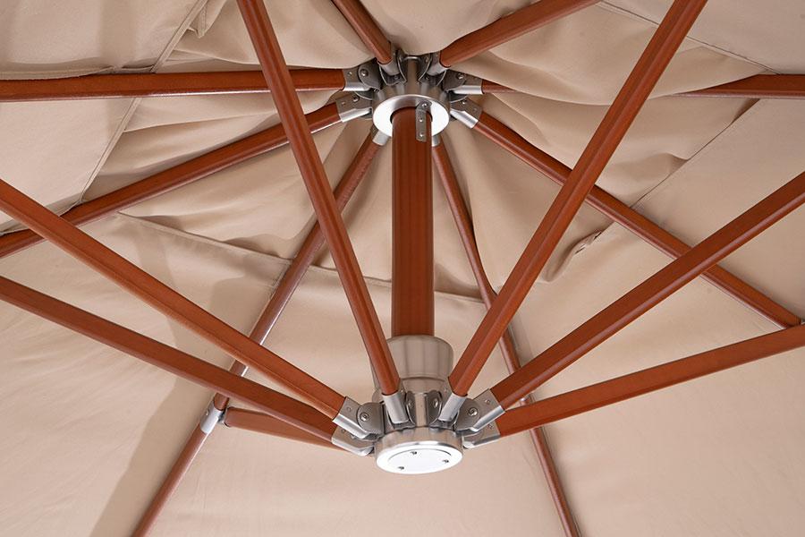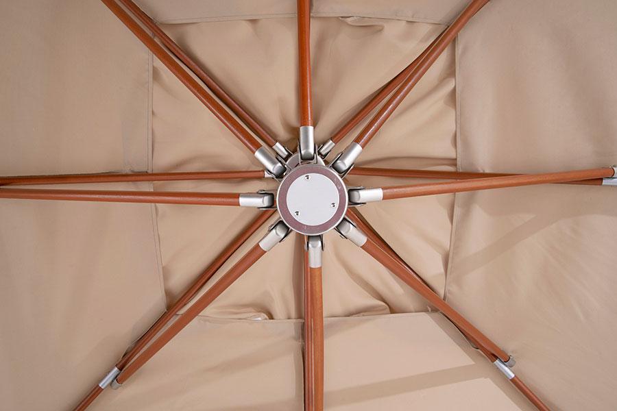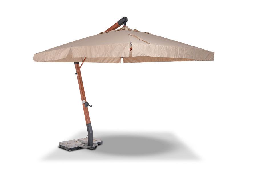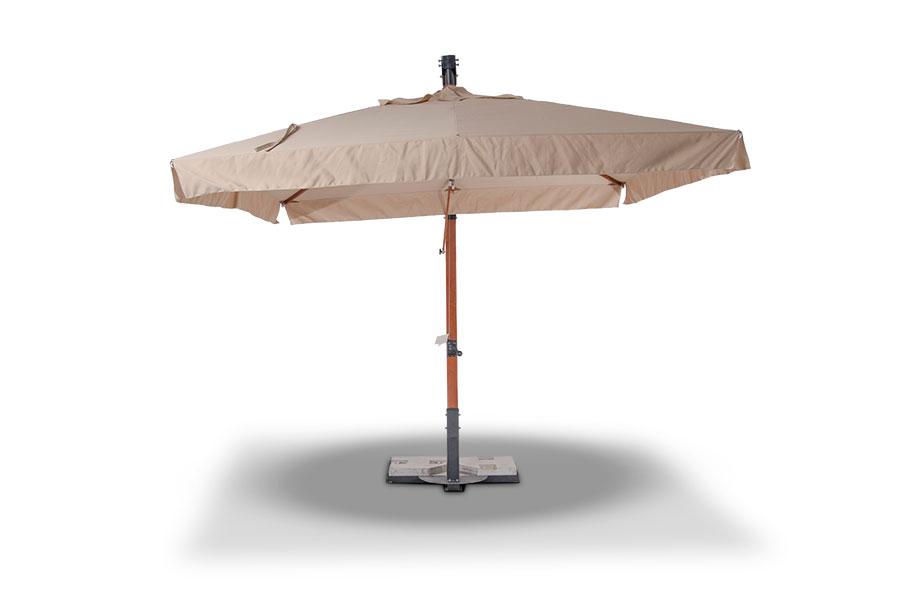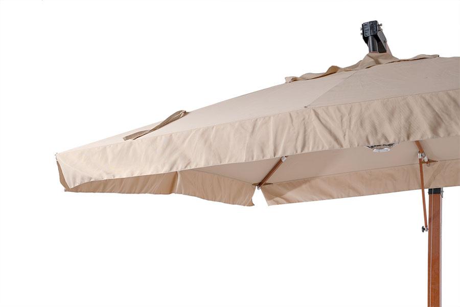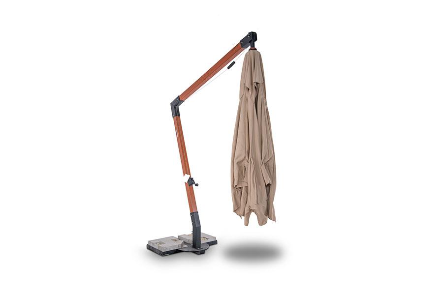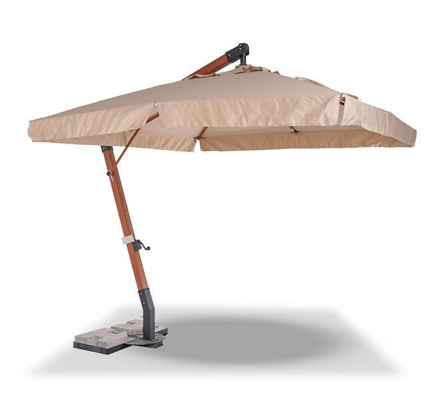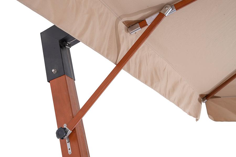 Ливорно, зонт 3×3м на боковой опоре, ткань Spunpoly плотностью 300гр/м2 Уличный зонт «Ливорно» на боковой алюминиевой опоре с размером купола 3×3 м и общей высотой 326 см. В основе - опора из индонезийской твердой древесины, толщиной 93×93 мм, состоящая из двух частей с черным стальным соединением. Длина нижней части - 220 см, верхней - 200 см. Окрашена в цвет «тик». Зонт оснащен деревянной ступицей с алюминиевой защитой и рукояткой с автоматической блокировкой и вращающимся механизмом на 36