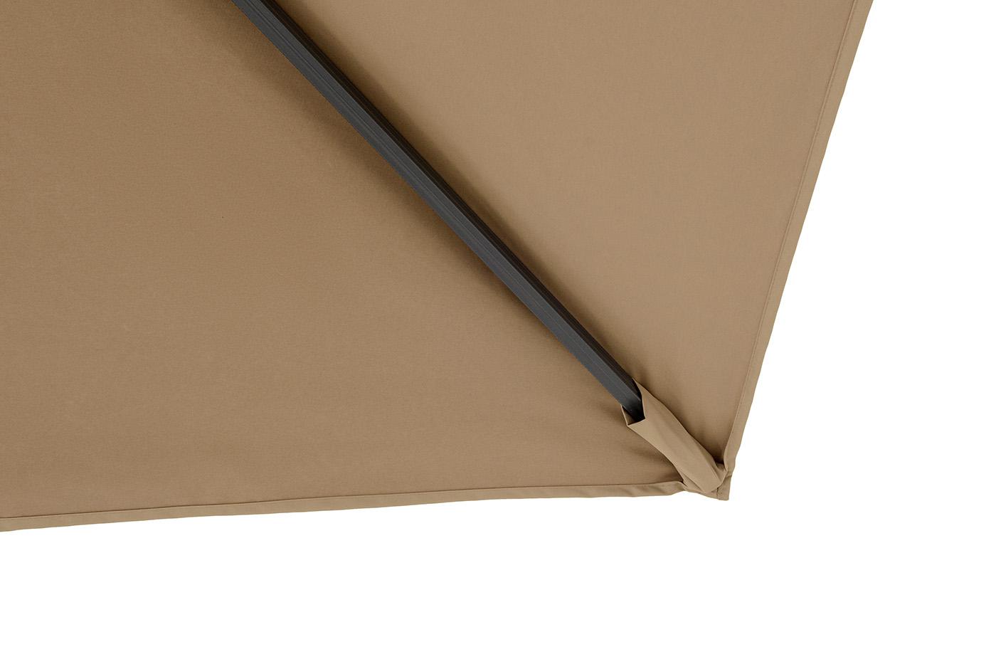 Зонт «Фабрианто» двухкупольный с равными сторонами 3×3м на центральной боковой алюминиевой опоре. Толщина опоры зонта 110×80 мм. Конструкция состоит из 16 длинных спиц (196 см - 8 шт. и 147 см - 8 шт.). Высота от земли до нижнего края купола - 220 см. Тент изготовлен из 100% полиэстера, плотностью 250 г/м2 с водоотталкивающей пропиткой, что гарантирует защиту не только от солнца, но и осадков в виде дождя. Зонт рекомендуется использовать при силе ветра не более 6 м/с. В стоимость зонта утяже