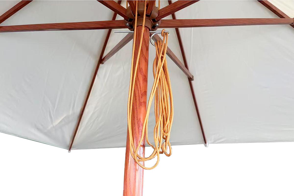 Тент изготовлен из полиэфирной ткани плотностью 180 г/м2, которая отличается натуральным внешним видом, не линяет, не садится, быстро сохнет и не пропускает влагу. Бежевый цвет ткани идеально сочетается с каркасом с поверхностью имитирующей дерево.