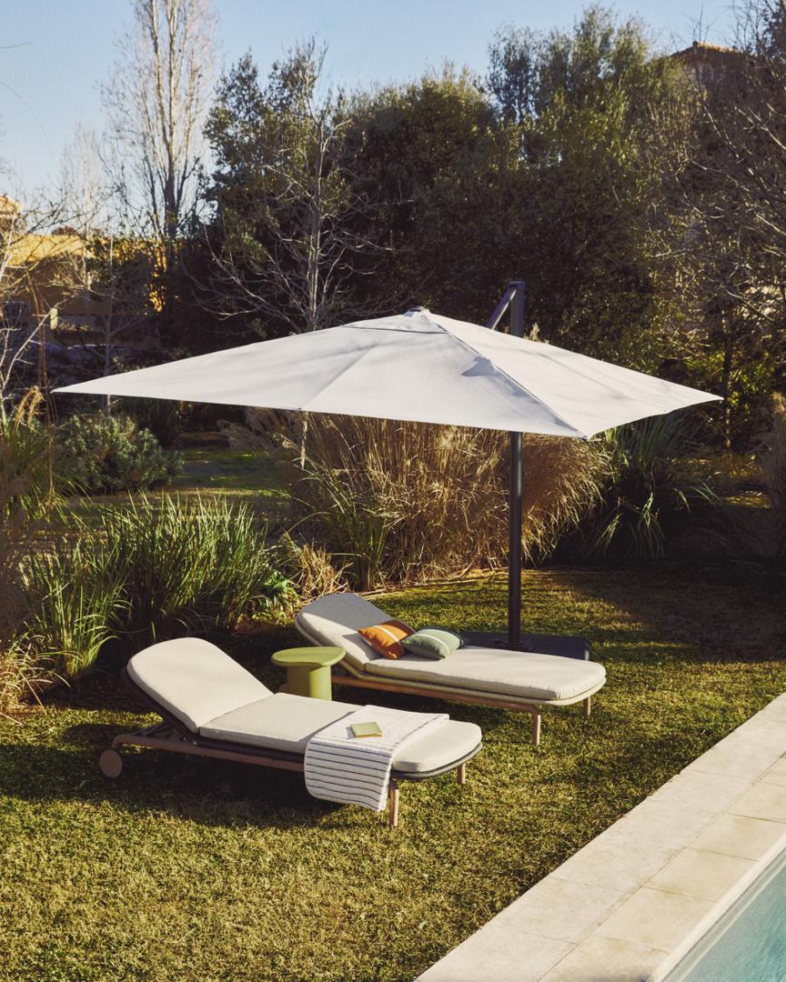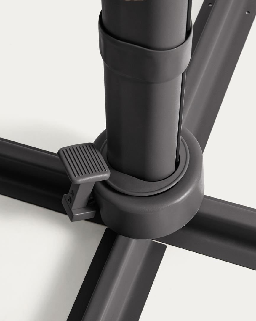 Консольный зонт Noli обеспечивает достаточное и регулируемое затенение для комфортного отдыха на открытом воздухе. Его алюминиевая конструкция с шарнирным боковым рычагом позволяет легко регулировать навес и освобождает пространство под зонтом, органично вписываясь в террасы и сады. Он может вращаться на 360° и наклоняться до 90°, адаптируясь к траектории движения солнца в течение дня. Система открывания с помощью рукоятки делает его удобным и простым в использовании. Ткань изготовлена из полиэстера плотностью 200 г/м².