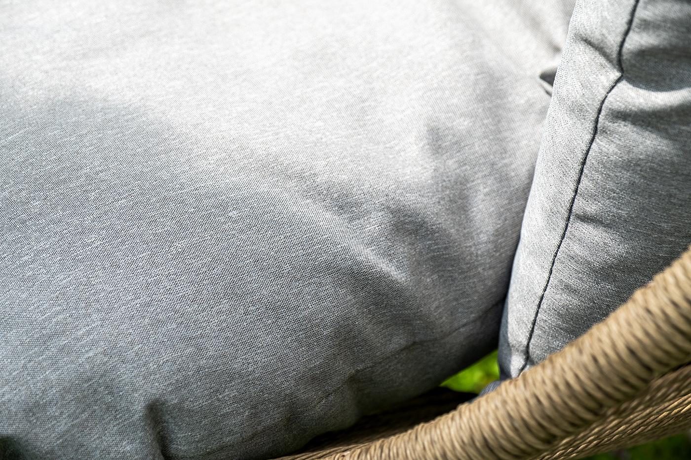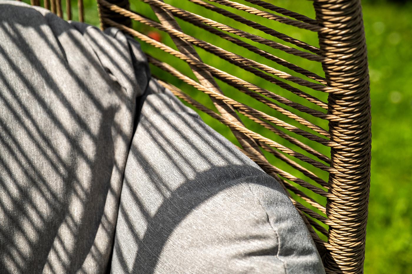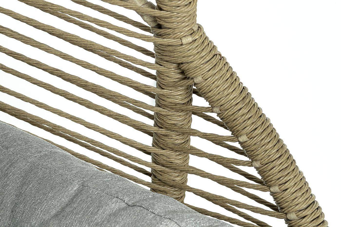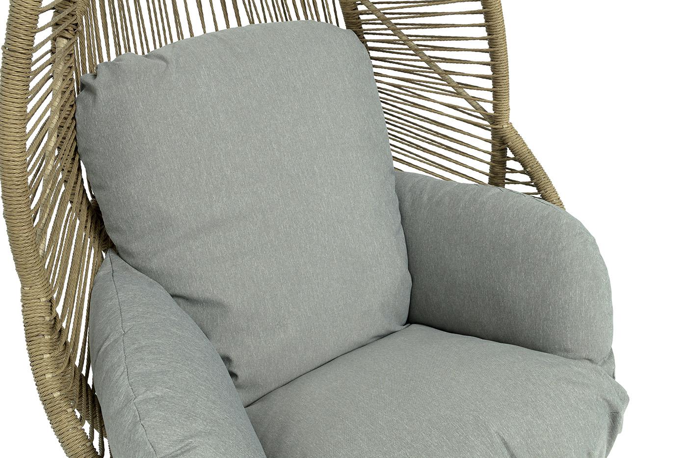 Подвесное плетеное кресло-кокон «Барселона» для организации зоны отдыха в саду, на террасе или летней площадке ресторана. Каркас изготовлен из стали, окрашенного порошковой износостойкой краской бежевого цвета. Оплетка – плоский искусственный ротанг соломенного оттенка. Материал устойчив к перепадам погоды и подходит для использования на открытых пространствах. Для удобства сидения на кресле предусмотрена удлиненная подушка светло-серого цвета из полиэстера с влагоотталкивающей пропиткой.