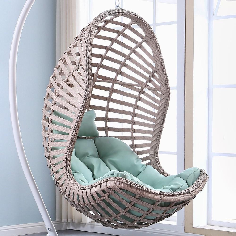 Размер корзины: W82xD75xH127 см Стойка: H2,0xD1,0 м, Каркас сталь. Материал плетения на корзине: широкий искусственный ротанг светло-бежевого цвета с имитацией под натуральную кожу. Подушка светло-зеленая. Ткань с водоотталкивающей пропиткой. Допустимая нагрузка: 120 кг.