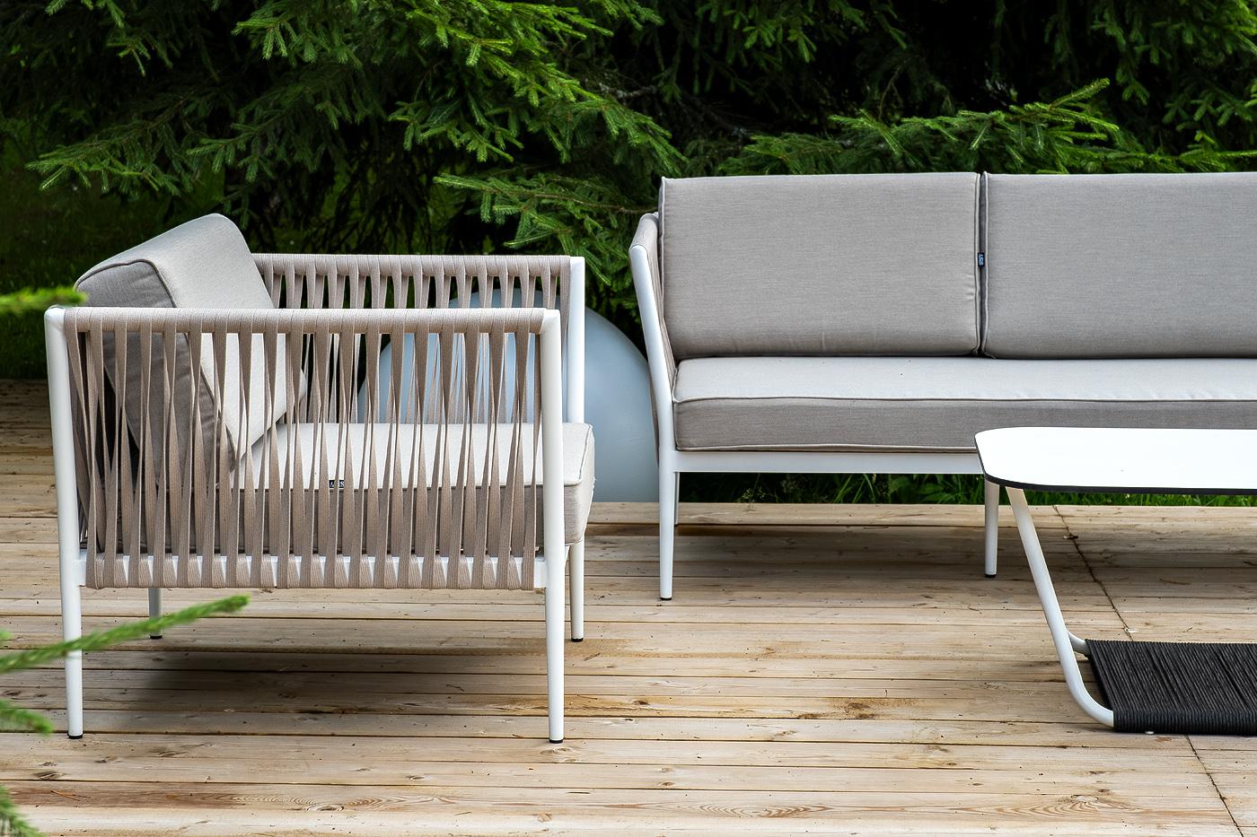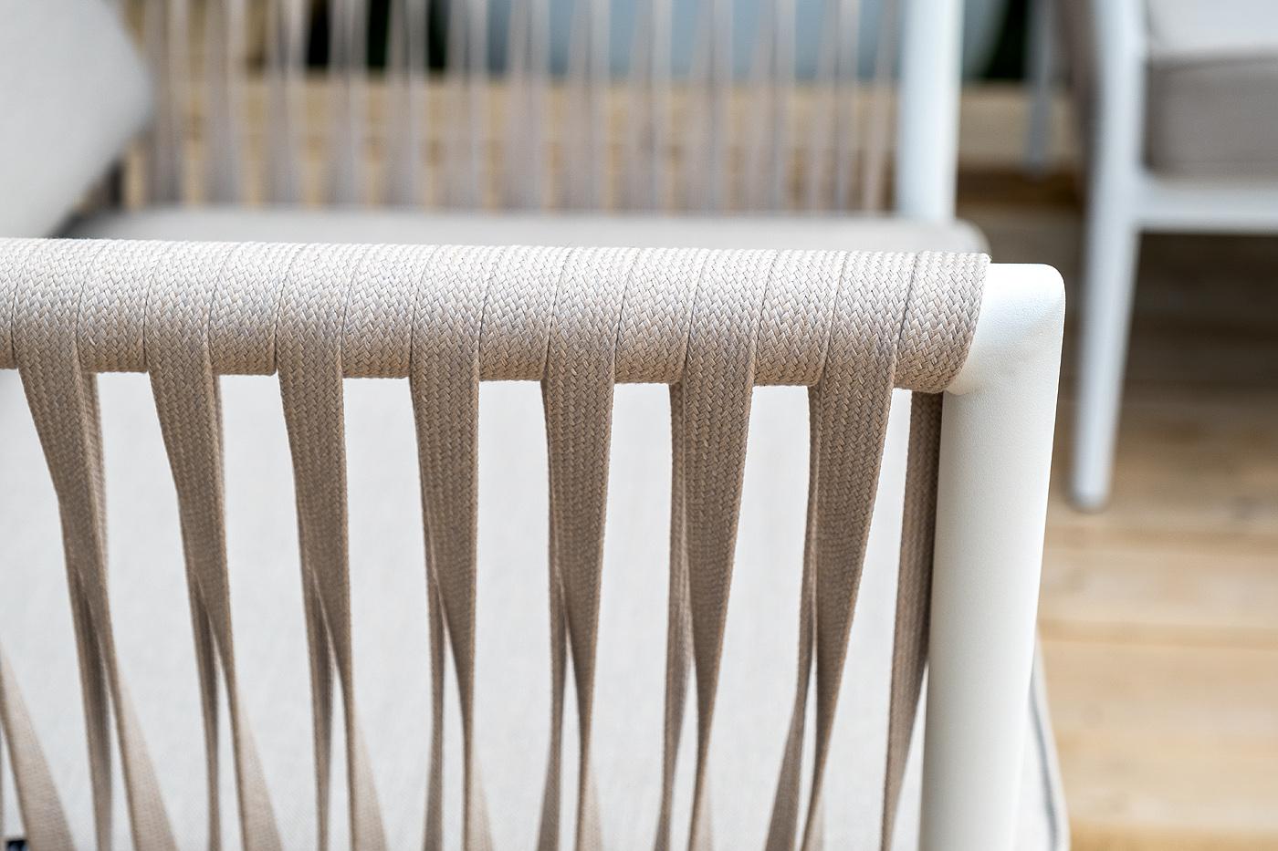 Лаунж-зона «Касабланка» расчитана на размещение 5-х персон. Состоит из: - трехместного дивана - 2150×800×695 мм. - двух кресел - 900×800×695 мм каждое. - журнального столика - 900×600×420 мм. Диван и кресла изготовлены их алюминиевого прочного каркаса, оплетенного ручным способом роупом бежевого цвета. Это эластичные ленты из полиэфирных волокон высокого качества. Каркас окрашен в белый цвет износостойкой порошковой краской. Журнальный столик также имеет алюминиевый каркас белого цвета. Столеш "Касабланка" диван 3-местный плетеный из роупа, каркас алюминий белый муар, роуп бежевый 20мм, ткань бежевая 052 1шт. 2 150Х800Х695, "Касабланка" кресло плетеное из роупа, каркас алюминий белый муар, роуп бежевый 20мм, ткань бежевая 052 2шт. 900Х800Х695, "Гранада" журнальный стол 90х60см из HPL, цвет "молочный", каркас белый муар, роуп темно-серый круглый 1шт. 900Х600Х420,