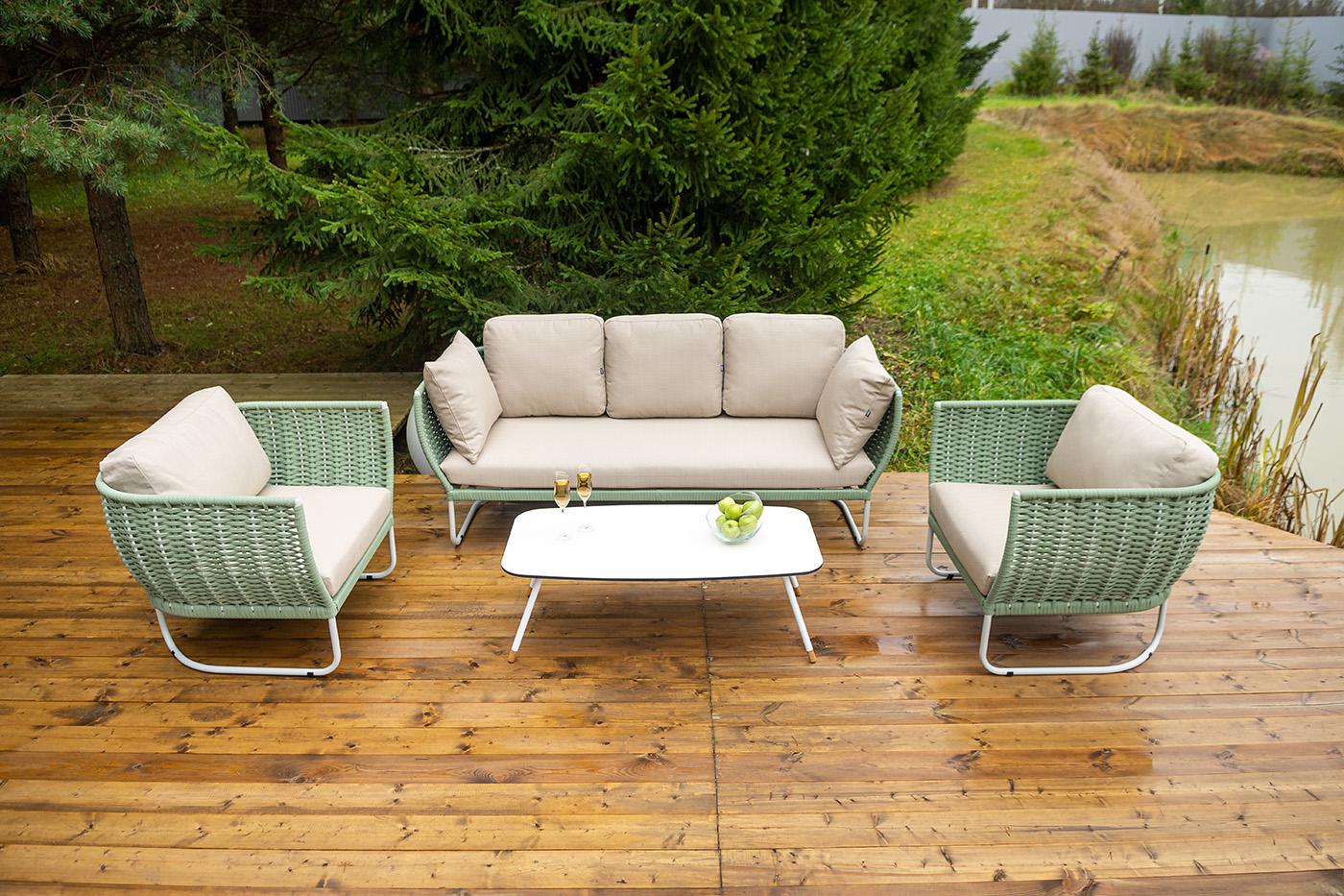 Лаунж-зона «Фиджи» — это готовое решение для уютного отдыха на террасе, в саду или на веранде. Комплект объединяет в себе практичность, стильный дизайн и комфорт. В лаунж-зону входят: - трехместный диван (2180×890×810 мм); - два плетеных кресла (1040×890×810 мм каждое); - журнальный столик (1200×650×400 мм). Каркас выполнен из износостойкого алюминия светло-серого цвета. Материал обеспечивает прочность, легкость и устойчивость к коррозии. Боковины дивана и кресел вручную оплетены зелеными синтетическими лентами из высокопрочных полиэфирных волокон. Плетение придает мебели выразительный облик и удачно дополняет цвет каркаса. В комплект входят мягкие подушки с бежевыми чехлами. Они создают уют и гармонично сочетаются с общей цветовой гаммой. "Фиджи" диван 3-местный плетеный из роупа, каркас алюминий светло-серый (RAL7035) муар, роуп зеленый (4204) круглый tex, ткань Mossle бежевая 1шт. 2 180Х890Х810, "Фиджи" кресло плетеное из роупа, каркас алюминий светло-серый (RAL7035) муар, роуп зеленый (4204) круглый tex, ткань Mossle бежевая 2шт. 1 040Х890Х810, "Верона" журнальный стол из HPL 120х65, H40, каркас белый муар, цвет столешницы "молочный" 1шт. 1 200Х650Х400,