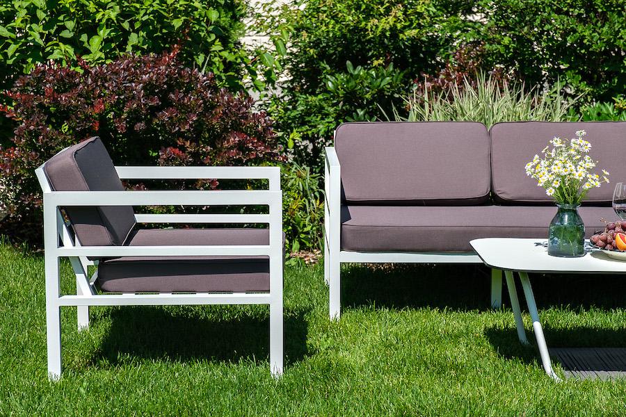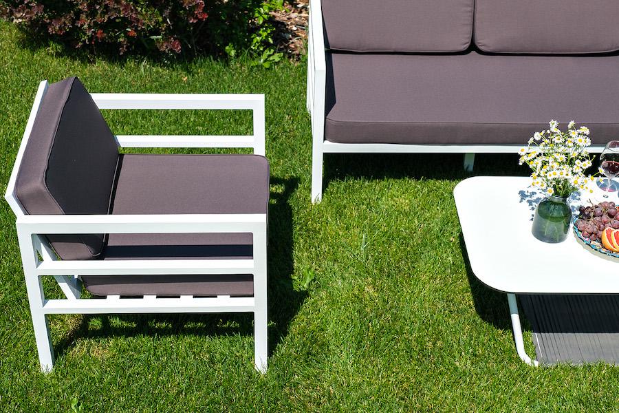 Лаунж-зона «Эстелья» для обустройства открытых пространств для отдыха. Рассчитана на 5 персоны. В комплект входят: - журнальный столик из алюминиевого каркаса и столешницы HPL. Размер - 900×600×420 мм. - треххместный диван -2080×760×730 мм. - два кресла - 780×760×730 мм. Каркас дивана и кресел выполнен из прочного алюминия и окрашен в белый цвет. Комплект дополняют подушки со съёмными чехлами и водоотталкивающей пропиткой темно-серого цвета. Материал чехлов - 100% полиэстер плотностью 300гр/м2. В нашем ассортимете имеется аналогичная лаунж-зона с двухместным диваном, которая вмещает до 4 человек. "Эстелья" диван 3-местный, каркас алюминий белый муар, ткань темно-серая 027 1шт. 2 080Х760Х730, "Эстелья" кресло интерьерное, каркас из алюминия 2шт. 780Х730Х650, "Глория" журнальный стол 90х60см из HPL, цвет "молочный" 1шт. 900Х600Х420,