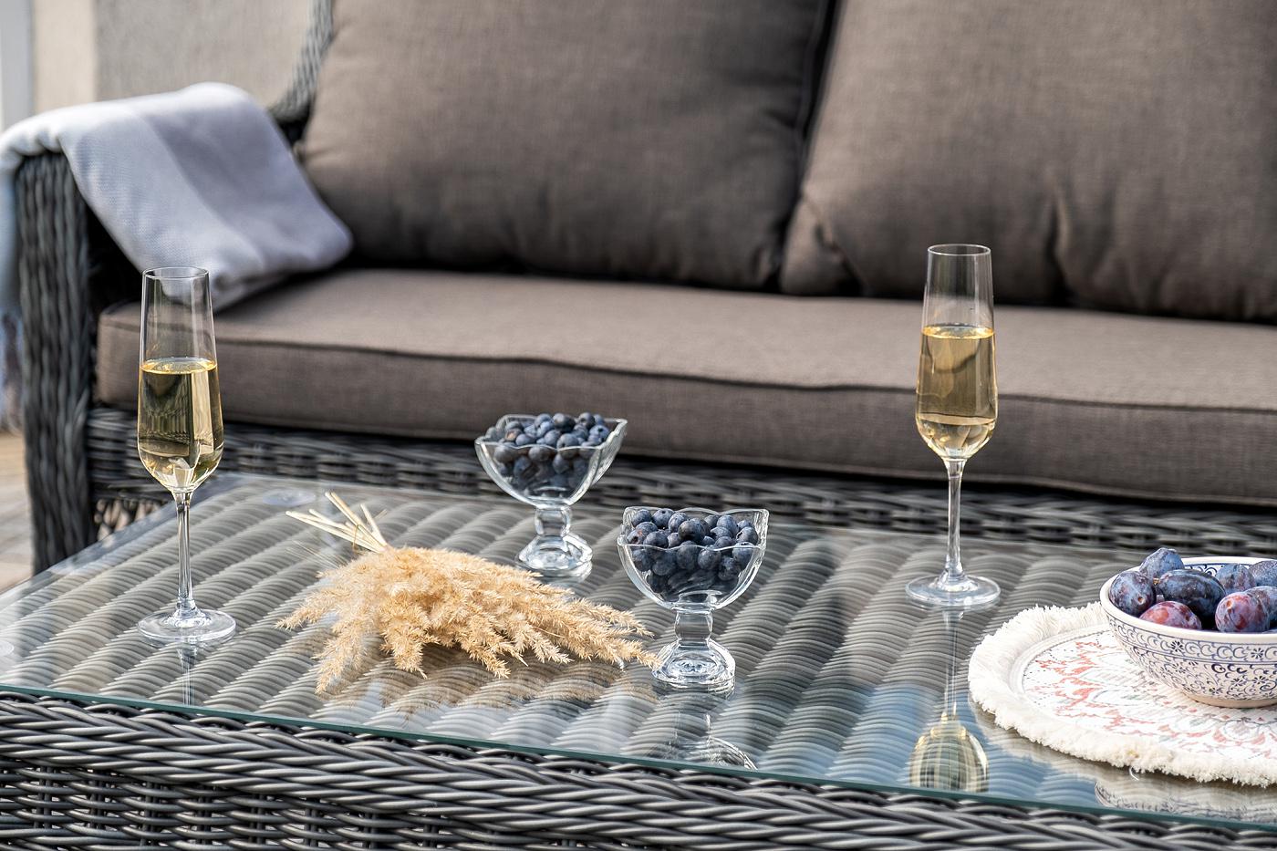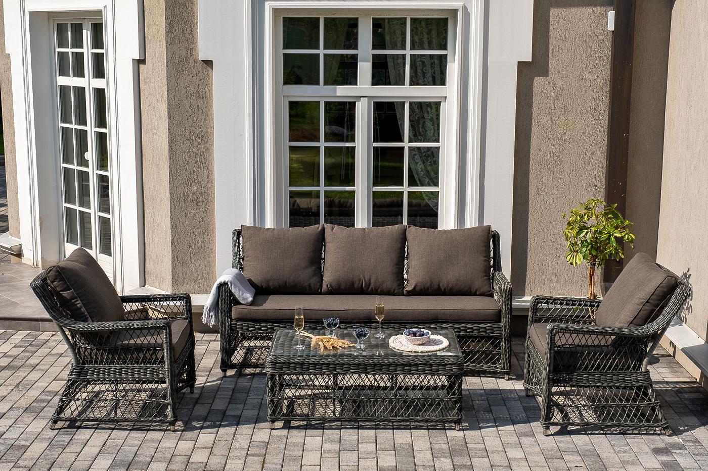 Лаунж-зона «Гранд Латте» включает в себя все необходимое для полноценного отдыха и рассчитана на одновременное размещение пяти персон. Плетеный комплект состоит из: - трехместного дивана, размер – 1875×830×850 мм. - двух кресел, размер – 720×830×850 мм. - журнального столика, размер – 1120×570×450 мм. Уличная мебель имеет алюминиевый каркас с ручным плетением из искусственного ротанга в цвете "графит". Предусмотрены мягкие подушки из полиэстера серого цвета с плотностью 300гр/м2. Они "Гранд Латте" диван трехместный из искусственного ротанга, цвет графит 1шт. 1 875Х830Х850, "Гранд Латте" кресло из искусственного ротанга, цвет графит 2шт. 720Х830Х850, "Гранд Латте" стол журнальный из искусственного ротанга, цвет графит 1шт. 1 120Х570Х450,