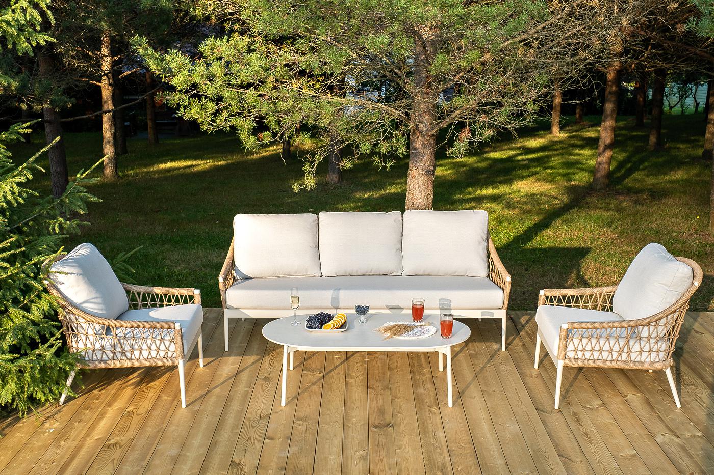 Вместительная лаунж-зона «Венеция» состоит из: - трехместного дивана – 2040×815×830 мм. - двух кресел – 800×800×855 мм. - журнального столика – 1300×700×380 мм. Модели имеют алюминиевый каркас, который оплетен вручную искусственным ротангом натурального соломенного цвета. Плетеная мебель дополнена удобными подушками в бежевых чехлах. При их изготовлении используют полиэстер, плотность – 300гр/м2. Он обрабатывается влагоотталкивающей пропиткой для повышения защитных свойств материала. "Венеция" диван из искусственного ротанга трехместный, цвет соломенный 1шт. 2 040Х815Х830, "Венеция" кресло из искусственного ротанга, цвет соломенный 2шт. 800Х800Х855, "Венеция" журнальный стол из искусственного камня овальный, 130х70см, Н38, цвет белый 1шт. 1 300Х700Х380,
