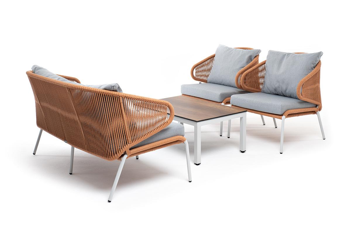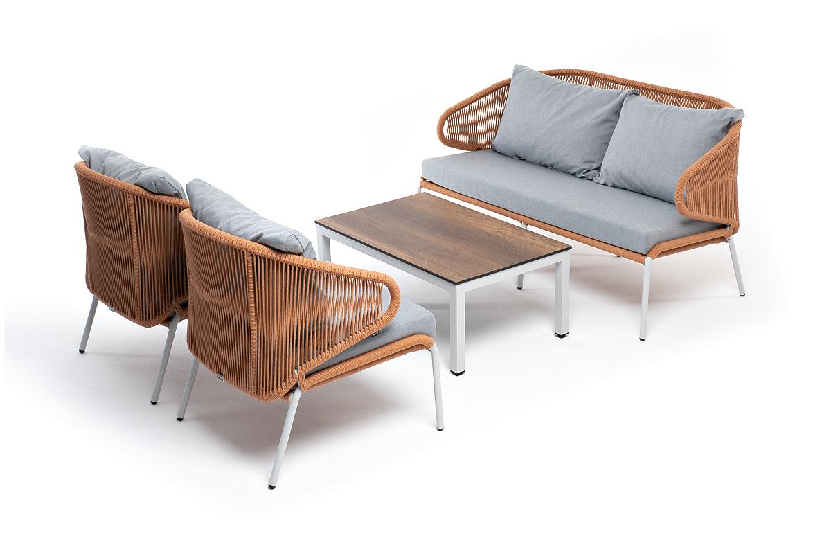 Лаунж-зона «Милан» предназначена для размещения четырех персон. Она включает в себя: - журнальный столик (размер - 900×600×400 мм). - два плетеных кресла (размер - 700×650×830 мм). - двухместный диван (размер - 1450×650×830 мм). Каркас уличной мебели выполнен из износостойкого алюминия. Его дополняет оплетка цвета оранжевый меланж, изготовленная на основе эластичных синтетических лент из полиэфирных волокон высокой прочности. Кресла и диван идут в комплекте с мягкими подушками в чехлах светло "Канны" журнальный столик из HPL 90х60, H40, каркас белый, цвет столешницы "дуб" 1шт. 900Х600Х400, "Милан" диван 2-местный плетеный из роупа, каркас алюминий светло-серый (RAL7035) муар, роуп оранжевый меланж круглый, ткань светло-серая 1шт. 1 450Х650Х830, "Милан" кресло плетеное из роупа, каркас алюминий светло-серый (RAL7035) муар, роуп оранжевый меланж круглый, ткань светло-серая 2шт. 700Х650Х830,