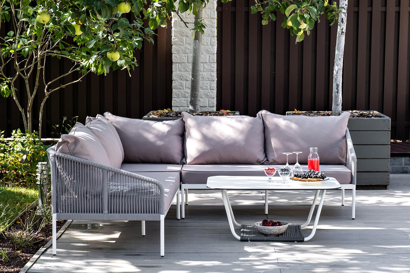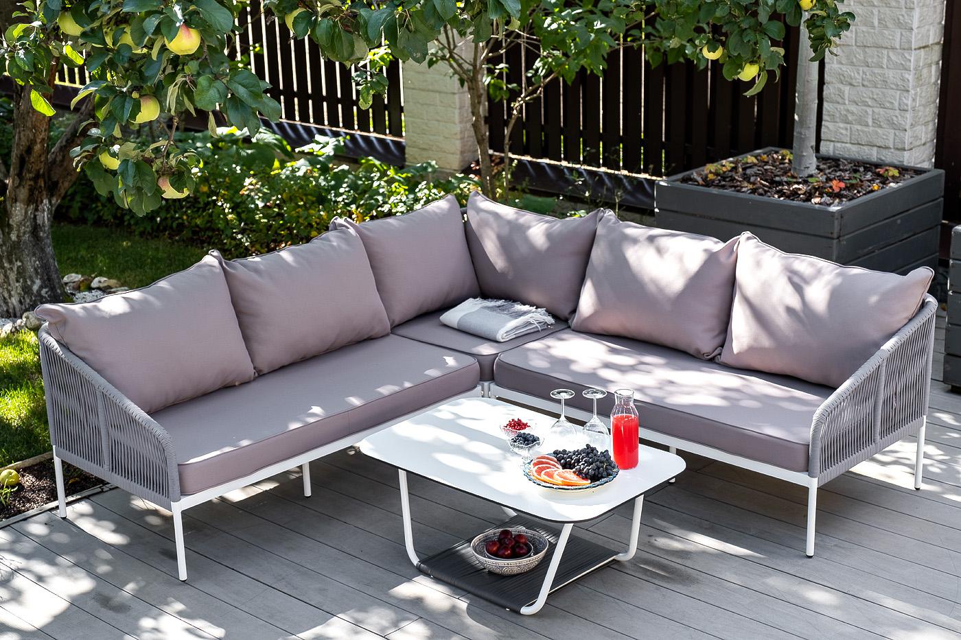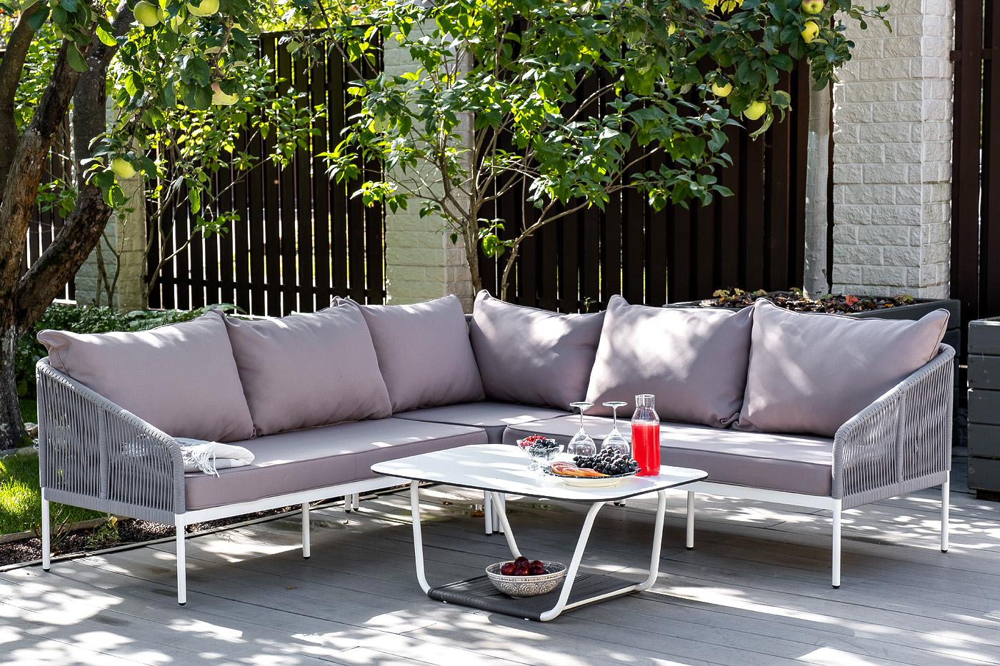 Модульная лаунж-зона «Канны» расчитана до шести персон. Комплект состоит из: - журнального столика (размер – 900×600×420 мм). - модульного диван (правый модуль - 1480×850×750 мм, угловой модуль - 850×850×750 мм, левый модуль - 1480×850×750 мм). Каркас уличной мебели выполнен из износостойкого алюминия. Его дополняет светло-серая ручная оплетка, изготовленная на основе эластичных синтетических лент из полиэфирных волокон высокой прочности (роупа). Диван идет в комплекте с мягкими подушками в ч "Канны" правый модуль плетеный из роупа, каркас алюминий белый шагрень, роуп светло-серый круглый, ткань светло-серая 1шт. 1 480Х850Х750, "Канны" левый модуль плетеный из роупа, каркас алюминий белый шагрень, роуп светло-серый круглый, ткань светло-серая 1шт. 1 480Х850Х750, "Канны" угловой модуль плетеный из роупа, каркас алюминий белый шагрень, роуп светло-серый круглый, ткань светло-серая 1шт. 850Х850Х750, "Гранада" журнальный стол 90х60см из HPL, цвет "молочный", каркас белый муар, роуп темно-серый круглый 1шт. 900Х600Х420,