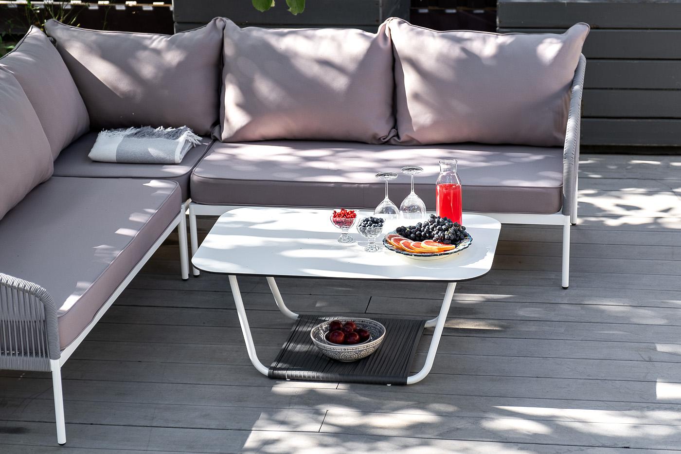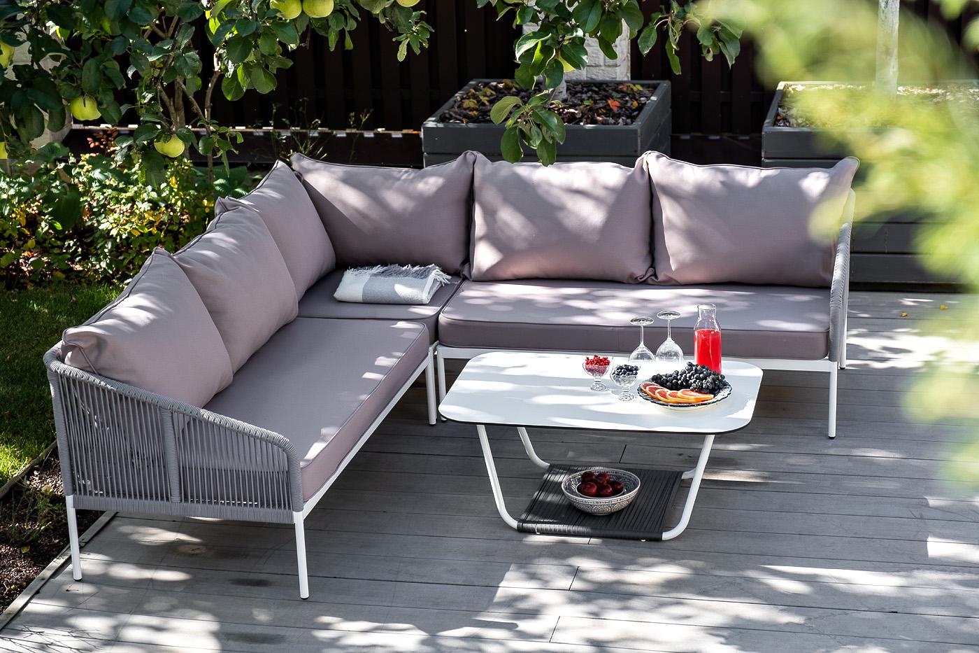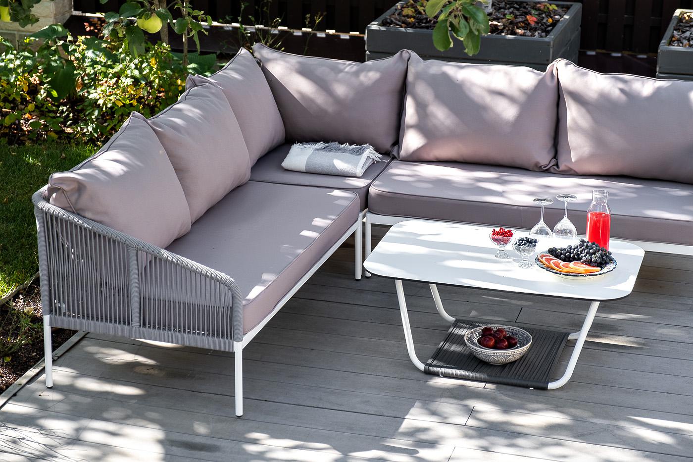 Модульная лаунж-зона «Канны» расчитана до шести персон. Комплект состоит из: - журнального столика (размер – 900×600×420 мм). - модульного диван (правый модуль - 1480×850×750 мм, угловой модуль - 850×850×750 мм, левый модуль - 1480×850×750 мм). Каркас уличной мебели выполнен из износостойкого алюминия. Его дополняет светло-серая ручная оплетка, изготовленная на основе эластичных синтетических лент из полиэфирных волокон высокой прочности (роупа). Диван идет в комплекте с мягкими подушками в ч "Канны" правый модуль плетеный из роупа, каркас алюминий белый шагрень, роуп светло-серый круглый, ткань светло-серая 1шт. 1 480Х850Х750, "Канны" левый модуль плетеный из роупа, каркас алюминий белый шагрень, роуп светло-серый круглый, ткань светло-серая 1шт. 1 480Х850Х750, "Канны" угловой модуль плетеный из роупа, каркас алюминий белый шагрень, роуп светло-серый круглый, ткань светло-серая 1шт. 850Х850Х750, "Гранада" журнальный стол 90х60см из HPL, цвет "молочный", каркас белый муар, роуп темно-серый круглый 1шт. 900Х600Х420,