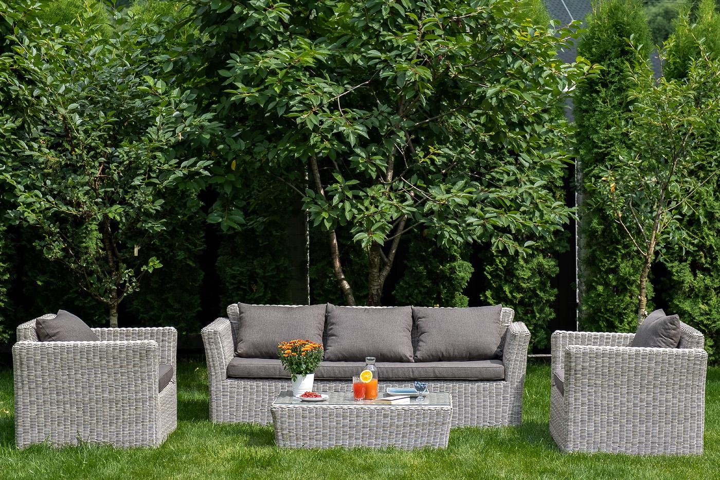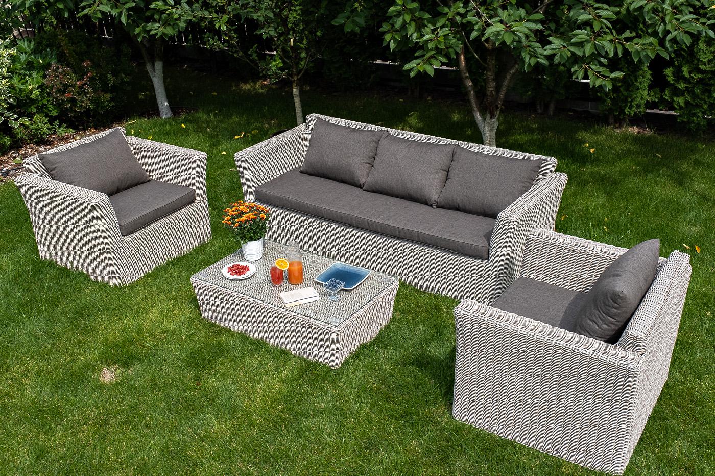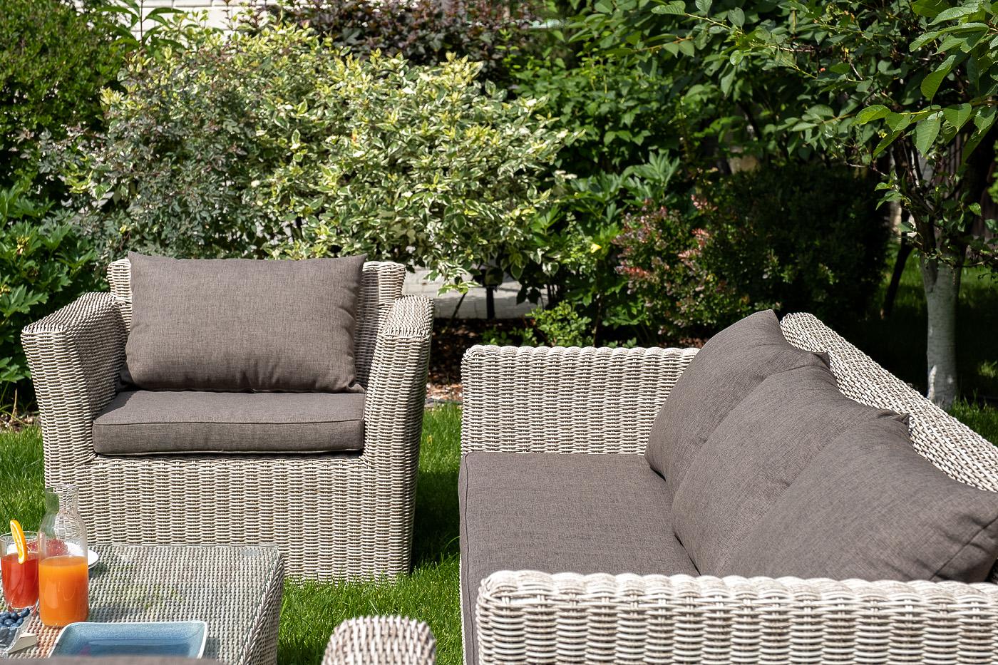 Лаунж-зона «Капучино» отличается хорошей вместительностью, поэтому подходит для комфортного отдыха компании до пяти человек. Комплект состоит из: - двух кресел (размер – 1040×865×815 мм). - журнального столика (размер – 1100×660×340 мм). - трехместного дивана (размер – 2220×865×815 мм). Из алюминия сделан устойчивый каркас мебели. Ее поверхность дополнена искусственным ротангом, из которого сделано ручное плетение, цвет бежевый. Кресла и диван идут в комплекте с подушками с серыми чехлами. Он "Капучино" диван из искусственного ротанга трехместный, цвет бежевый 1шт. 2 220Х865Х815, "Капучино" кресло из искусственного ротанга, цвет бежевый 2шт. 1 040Х865Х815, "Капучино" журнальный столик из искусственного ротанга, цвет бежевый 1шт. 1 100Х660Х340,