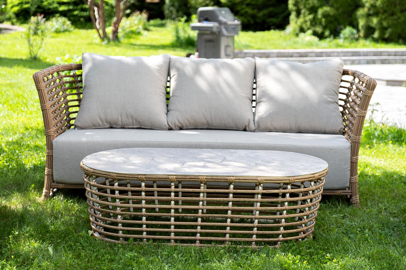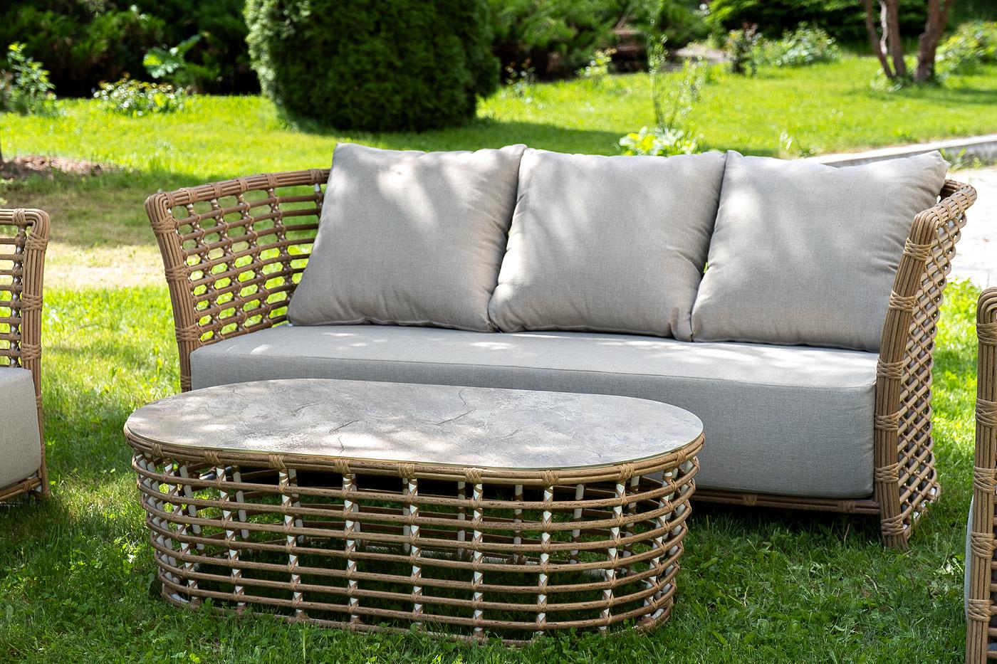 Вместительная лаунж-зона «Валенсия» состоит из: - трехместного дивана – 2020×850×800 мм. - двух кресел – 1000×850×800 мм. - журнального столика – 1270×630×420 мм. Модели имеют алюминиевый каркас, который оплетен вручную искусственным ротангом соломенного цвета. Плетеная мебель дополнена удобными подушками в бежевых чехлах. При их изготовлении используют полиэстер, плотность – 300гр/м2. Он обрабатывается влагоотталкивающей пропиткой для повышения защитных свойств материала. Журнальный столик в "Валенсия" журнальный столик из искусственного ротанга, цвет соломенный 1шт. 1 270Х630Х420, "Валенсия" диван из искусственного ротанга трехместный, цвет соломенный 1шт. 2 020Х850Х800, "Валенсия" кресло из искусственного ротанга, цвет соломенный 2шт. 1 000Х850Х800,