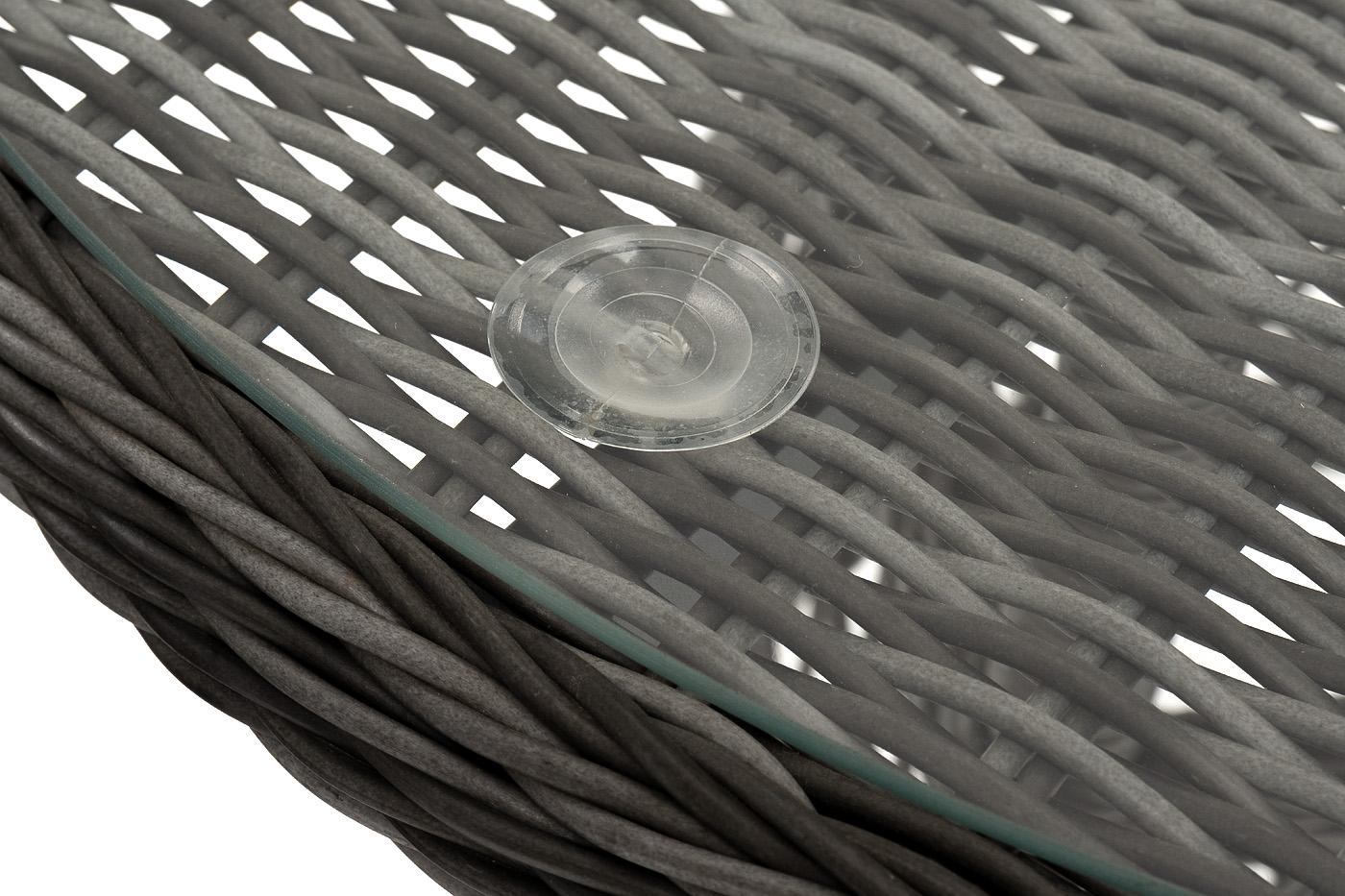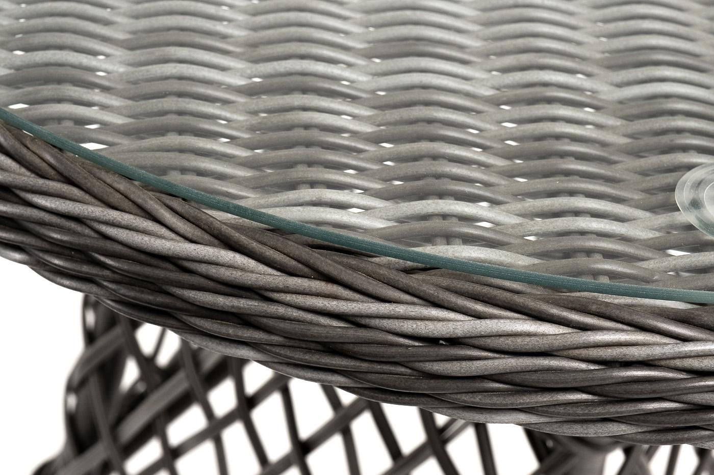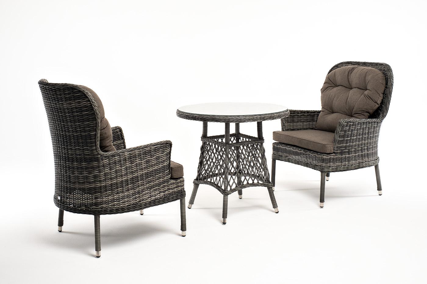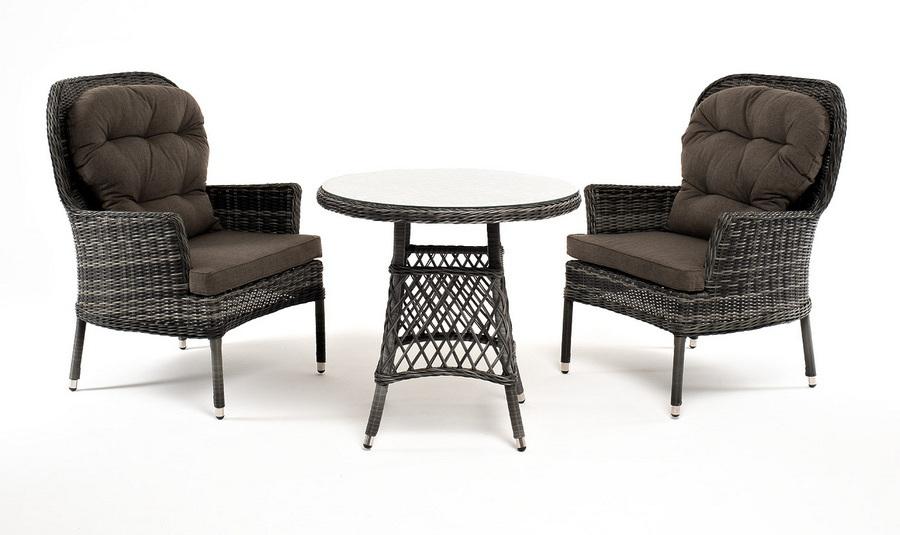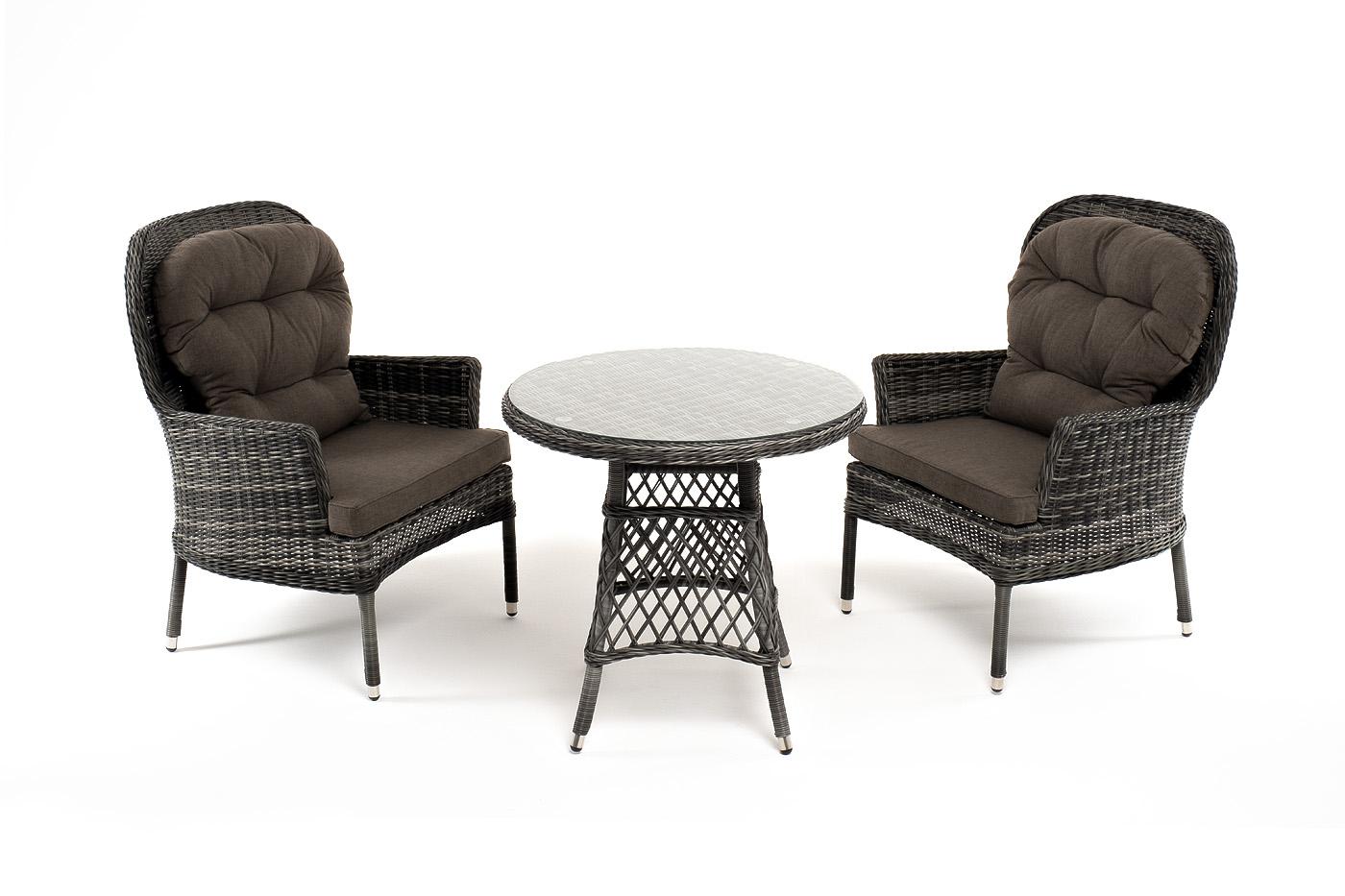 Кофейный комплект «Алиса» рассчитан на 2 персоны и подходит для расположения на балконе, в небольших гостиных, на террасе и других местах с ограниченным пространством. В основе каркас из алюминия. В состав входят: – круглый стол 800×800×750 мм (толщина стеклянной столешницы в 0,5 см). – 2 кресла - 710×820×1105 мм. Плетение выполнено вручную круглым искусственным ротангом графитового цвета, кресло укомплектовано подушками из 100% полиэстера, которые пропитаны специальным составом, обладающим вл "Алиса" кресло плетеное, цвет графит с подушками 2шт. 710Х820Х1 105, "Эспрессо" плетеный круглый стол, диаметр 80 см, цвет графит 1шт. 800Х800Х750,