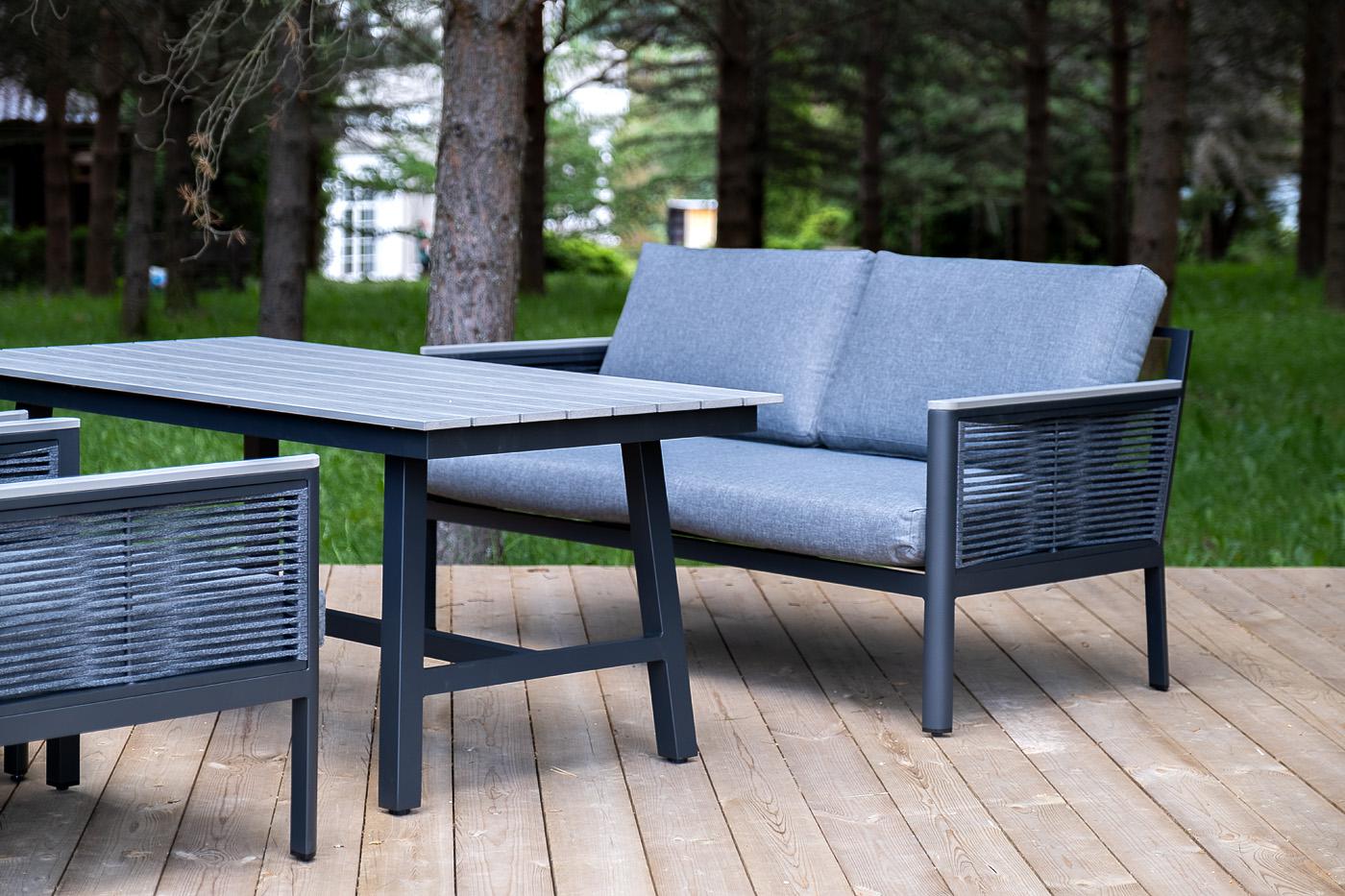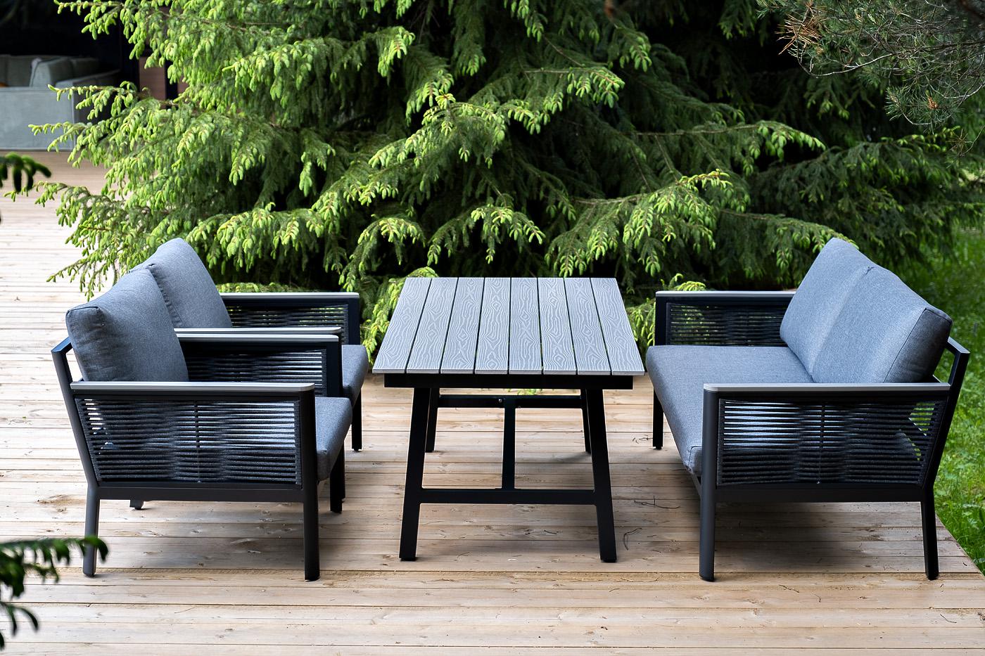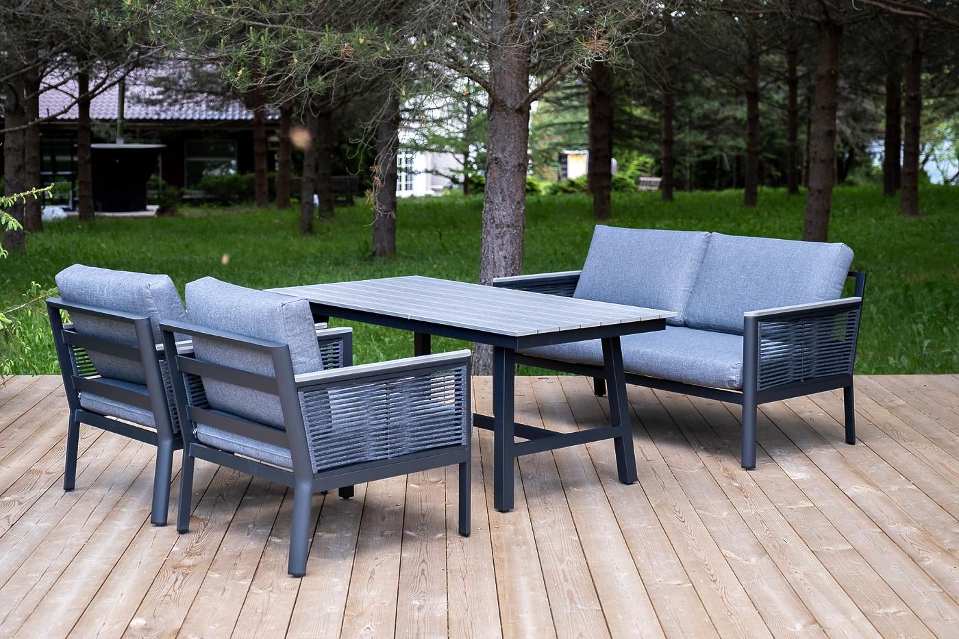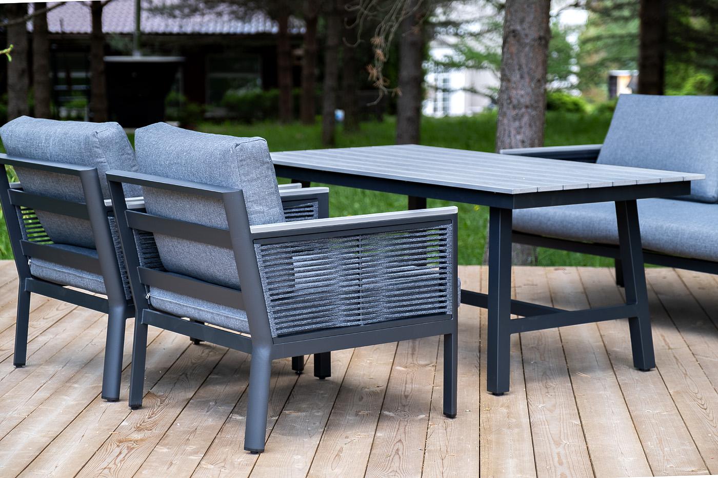 «Сан Ремо» лаунж-зона, алюминиевый каркас серый цвета, вручную оплетенный роупом серого цвета. В состав комплекта входит: - двухместный диван 1460×780×700 мм. - два кресла 680×780×700 мм. - стол обеденный 1500×800×650 мм. Диван и кресла оснащены подушками серого цвета со съёмными чехлами. Стол со столешницей из ДПК. "Сан Ремо" кресло плетеное из роупа садовое, каркас алюминий темно-серый, роуп серый, ткань серая 2шт. 680Х780Х700, "Сан Ремо" диван 2-местный плетеный из роупа, каркас алюминий темно-серый, роуп серый, ткань серая 1шт. 1 460Х780Х700, "Сан Ремо" стол обеденный из ДПК, каркас алюминиевый темно-серый 1шт. 1 500Х800Х650,