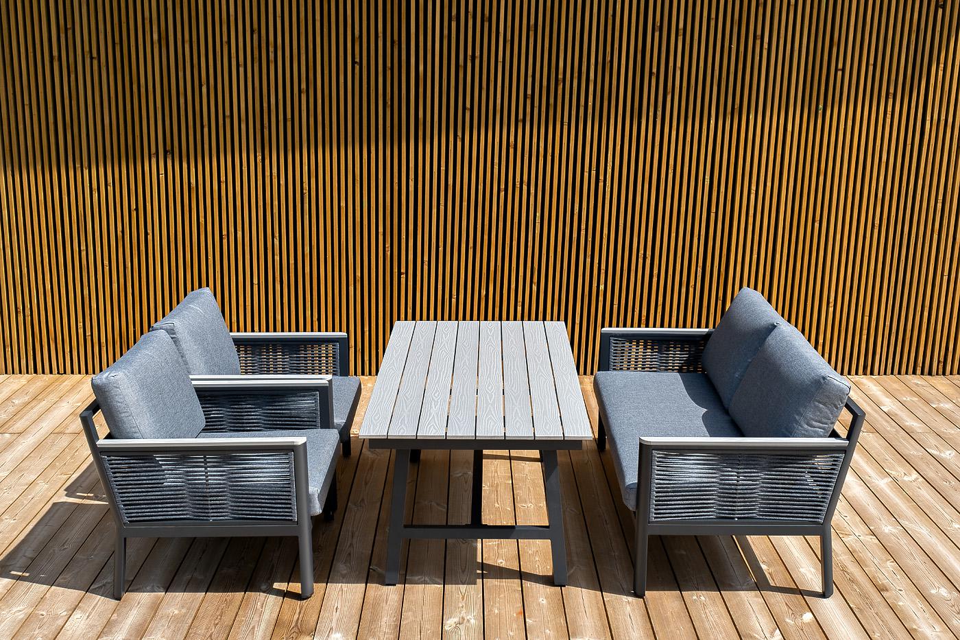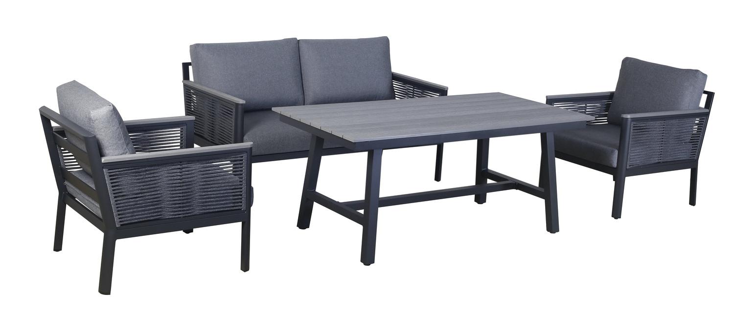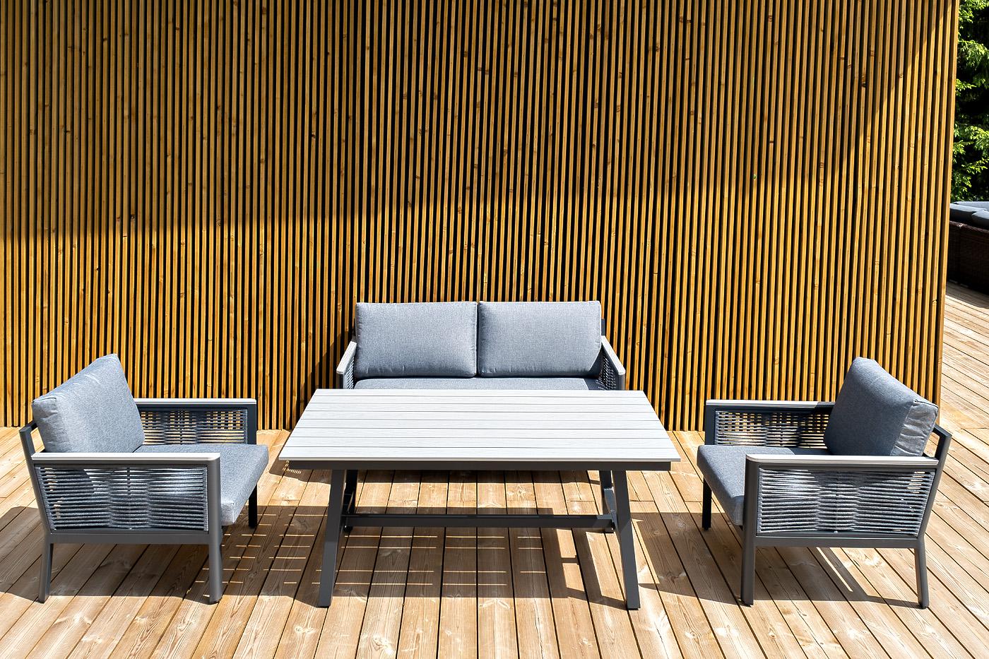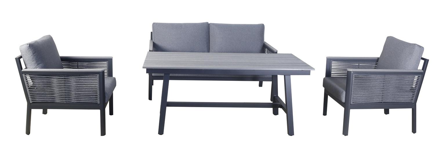 «Сан Ремо» лаунж-зона, алюминиевый каркас серый цвета, вручную оплетенный роупом серого цвета. В состав комплекта входит: - двухместный диван 1460×780×700 мм. - два кресла 680×780×700 мм. - стол обеденный 1500×800×650 мм. Диван и кресла оснащены подушками серого цвета со съёмными чехлами. Стол со столешницей из ДПК. "Сан Ремо" кресло плетеное из роупа садовое, каркас алюминий темно-серый, роуп серый, ткань серая 2шт. 680Х780Х700, "Сан Ремо" диван 2-местный плетеный из роупа, каркас алюминий темно-серый, роуп серый, ткань серая 1шт. 1 460Х780Х700, "Сан Ремо" стол обеденный из ДПК, каркас алюминиевый темно-серый 1шт. 1 500Х800Х650,